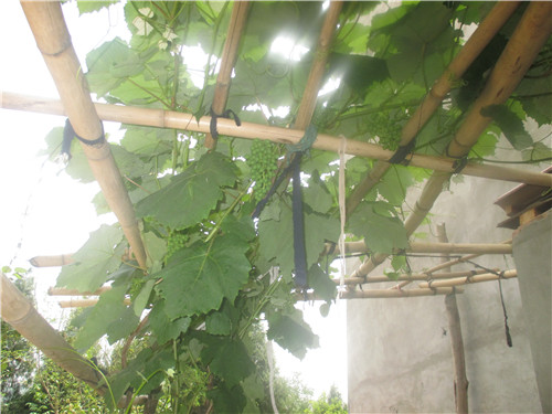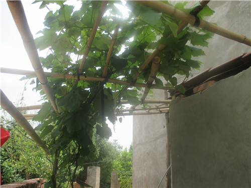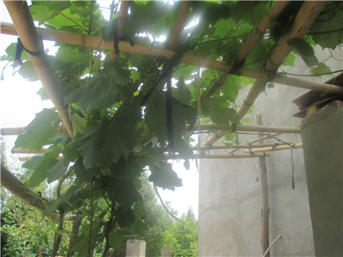 夏天,葡萄长成一串串的,让人看一眼就想尝尝它的滋味。可是葡萄还没成熟,每一颗都只有一粒豌豆大小,它又酸又涩,一点儿也不好吃,当炎热的太阳照在大地上,葡萄棚底下就成了最好的游戏场所。你可以在棚底下打扑克牌,聊天,感觉是那么的凉爽。