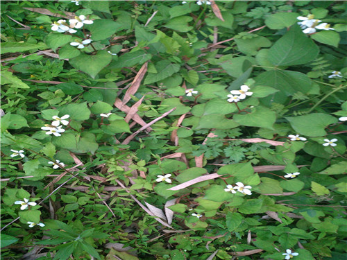 我来到屋后的地里,发现鱼腥草长的密密麻麻的,而且绿油油的,我刚剪了一些,就看见旁边的鱼腥草有的开花了,花瓣雪白雪白的,花心黄灿灿的,美丽极了!