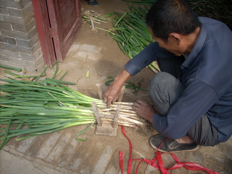 分开的葱还要扎成捆,而且捆的大小基本也是固定的,你看,一般都是用这样的小凳子来帮助。捆葱的时候也有些“小动作”外围找一些粗细均匀,而且较长的葱做外观,里面有时候就夹杂着短小或半截葱,这样当用绳子结实的捆绑后,从外面根本看不到里面的情况,由于绳子扎的很结实,用手也较难掰开看到里面,成捆的葱先放到自家的磅上称一下,做到心中有数,防止葱贩子在秤上使怪呀!