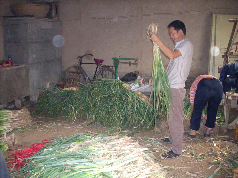 这里的工序还挺复杂的,回到家后,先把葱卸下来,然后需要整理,所谓整理也就是先将干枯的叶子摘下,然后大小分开。因为大小不同的葱价格不同,小葱的收购价格要贵5、6分钱呢?太粗的葱人家还嫌弃呢?