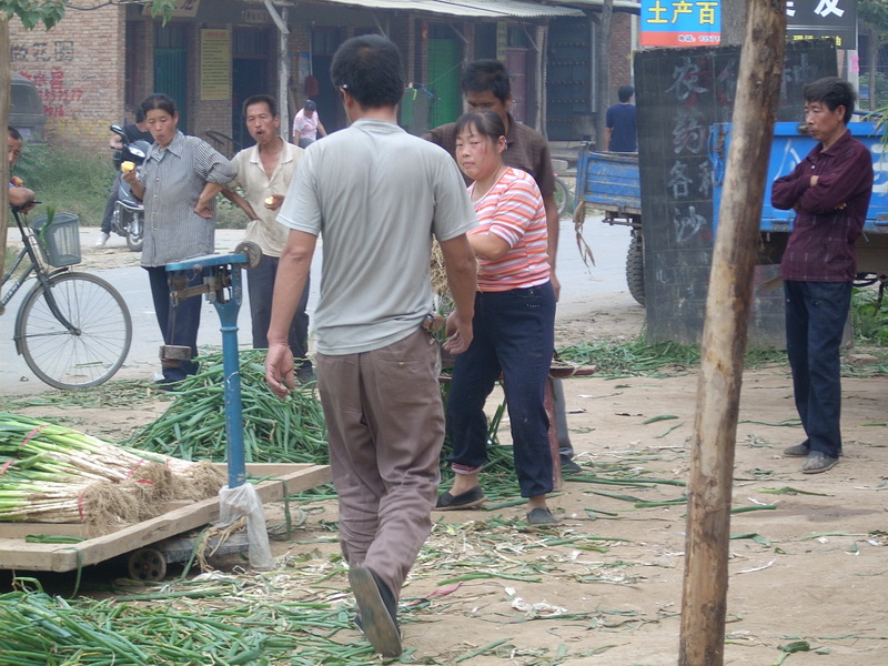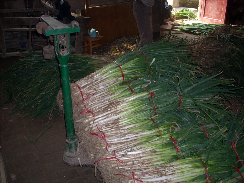 我们把葱整理后扎成捆,放在自家的磅上先称量一下,为的是自己心里有个数,防止被买家骗了.我们这里这几年几乎每家都有葱,所以家家都有这样的磅秤.
