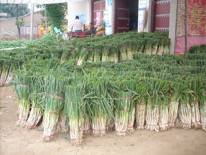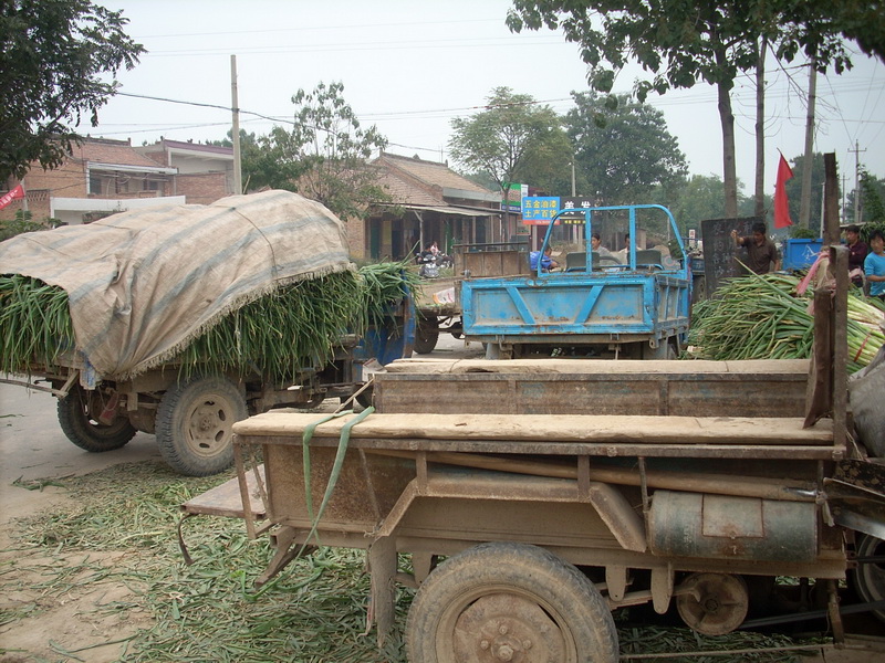 忙了一大晌,差不多可以装一车了,我们就开始装车,农用三轮车每家也都有.装了满满一车,就向专门的收购点出发了,这里街道两侧,有好几家收购点,可以看到堆积如山的葱堆子.各摊点前停放着许多三轮车.
