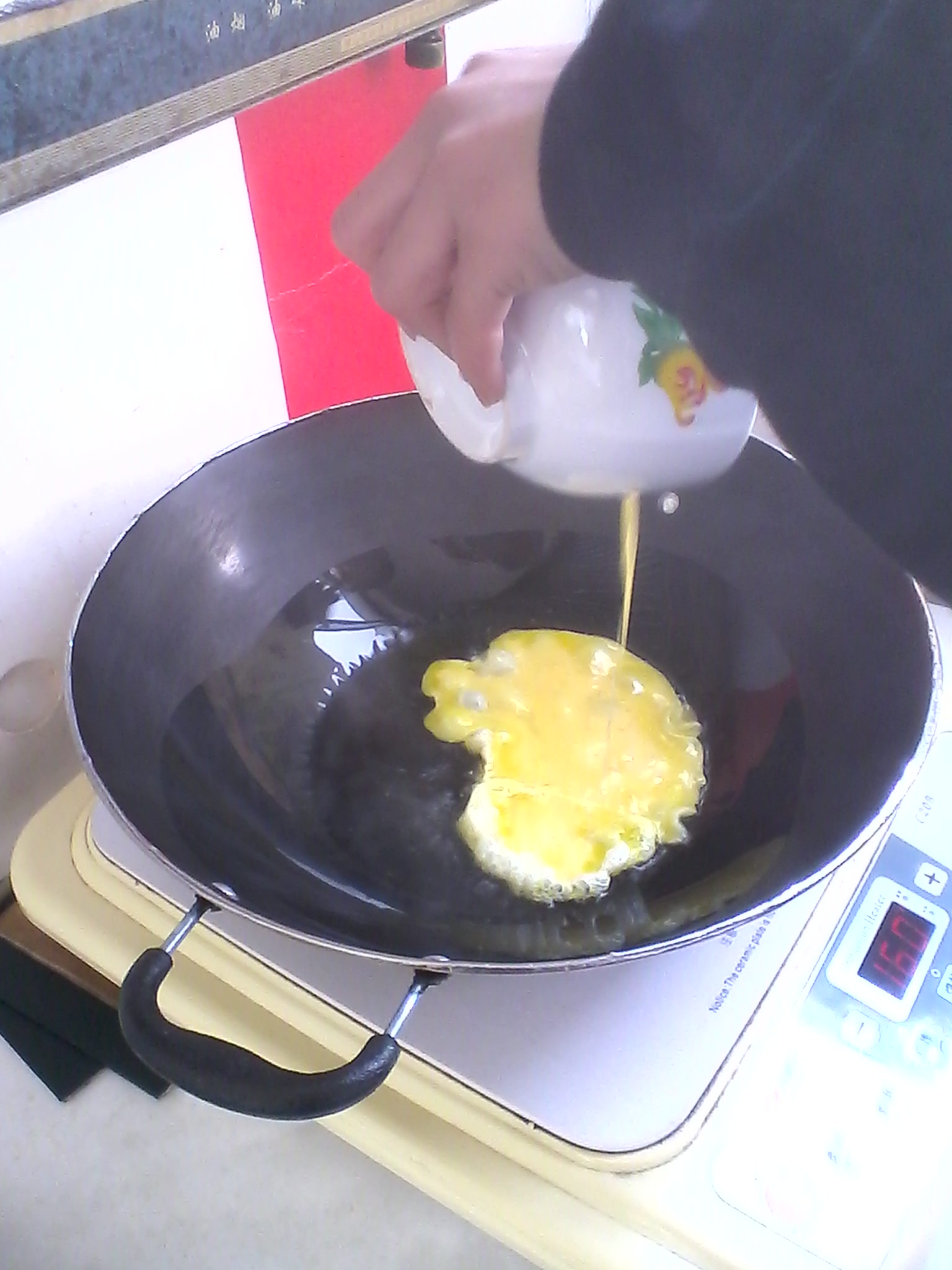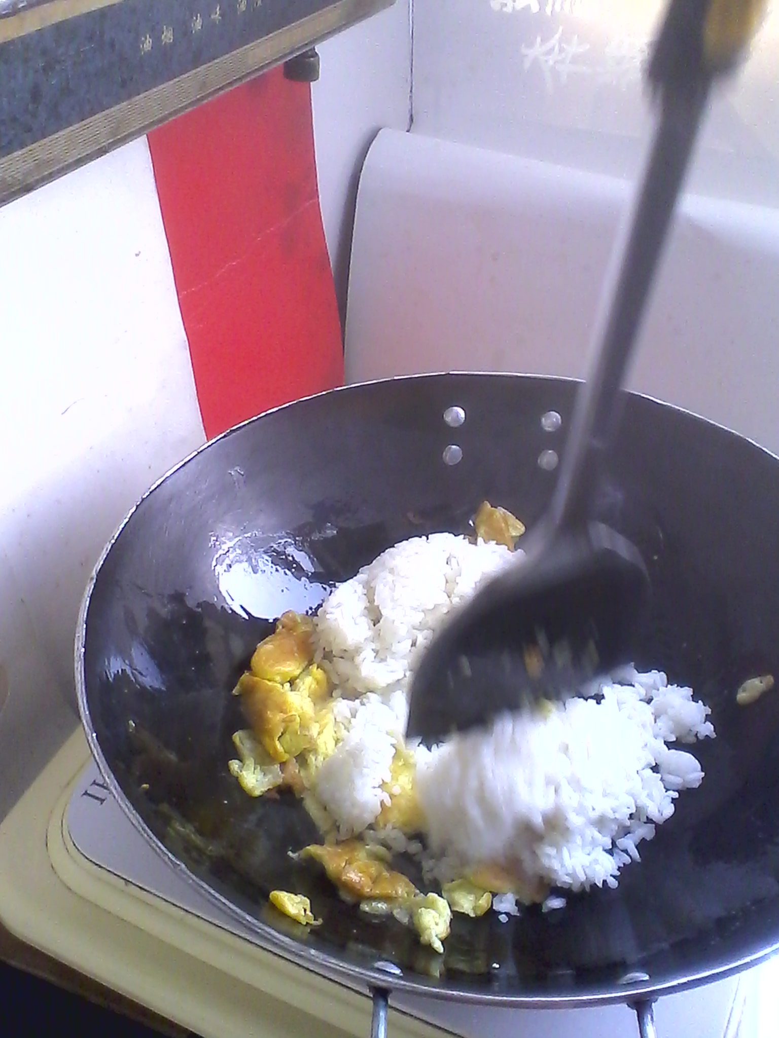 我在妈妈的指导下,小心翼翼的打开电磁炉,把锅暖了一小会,感觉有热气出来时我倒上了一小勺的油,妈妈告诉我说油熟到七八分时,就让我往锅里倒入已经打好的鸡蛋,翻炒一分钟,有点鸡蛋的香气出来时,倒入剩米饭,撒上一点盐和鸡精,继续用勺子翻炒,待饭粒呈金黄色时,我又撒上事先准备好的辣椒和火腿肠,炒了两下,就可以起锅,这样我亲手做的香喷喷的蛋炒饭就成功喽!