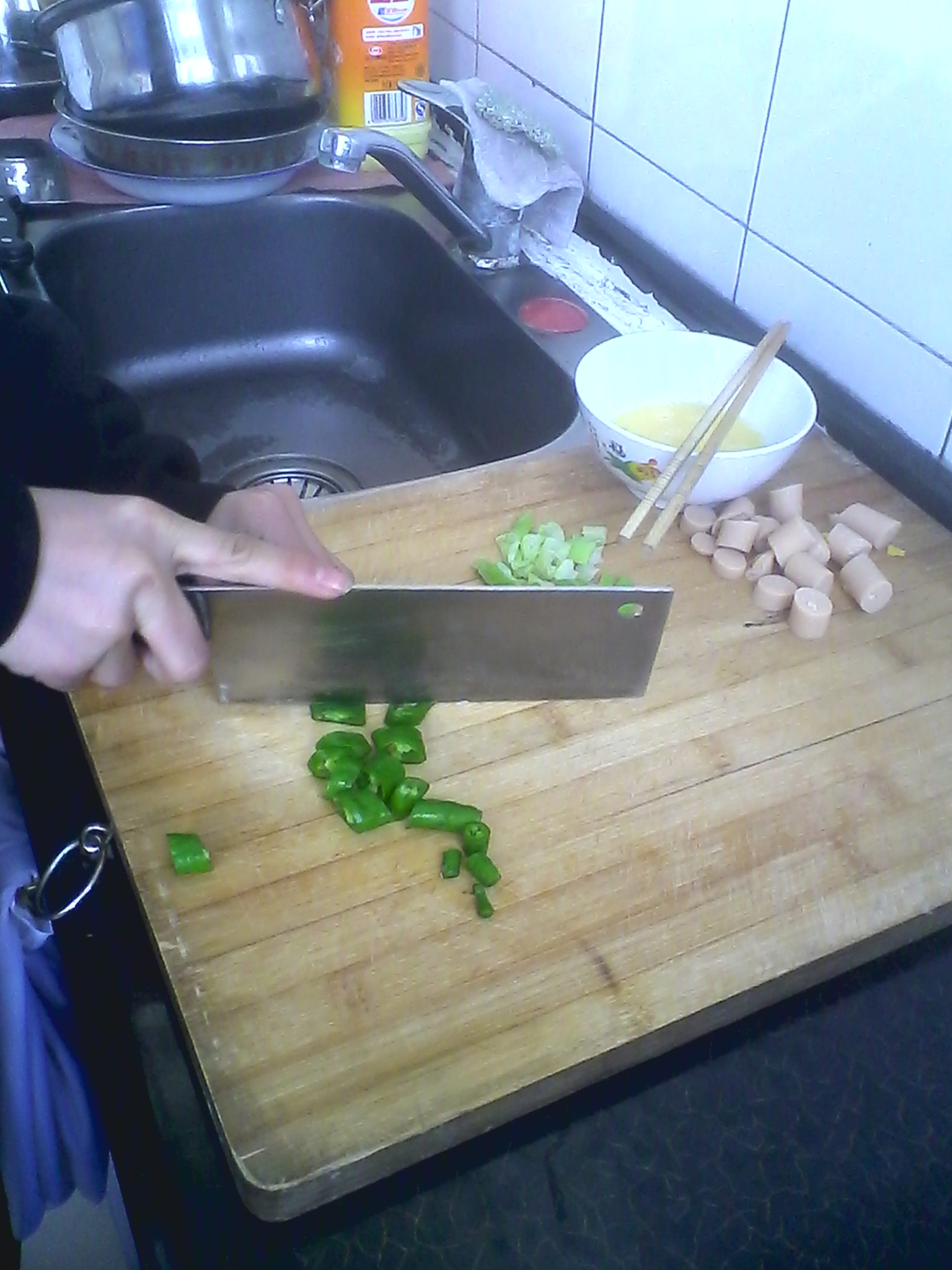 首先,我拿出二个鸡蛋,轻轻敲了一下,把蛋倒在碗里,用筷子飞速的在碗里旋转,见蛋打的差不多了。然后我拿出了辣椒和火腿肠,把它们切碎。