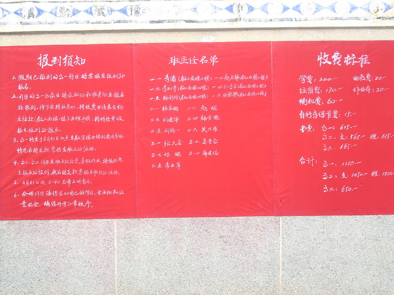 报名前,先要到这里看一看,这里张贴着报名须知、班主任名单以及收费标准。按照须知,应该先带着成绩汇报单、告家长书、寒假作业等,到班主任老师处开报到条,然后凭报到条到交费处交费。