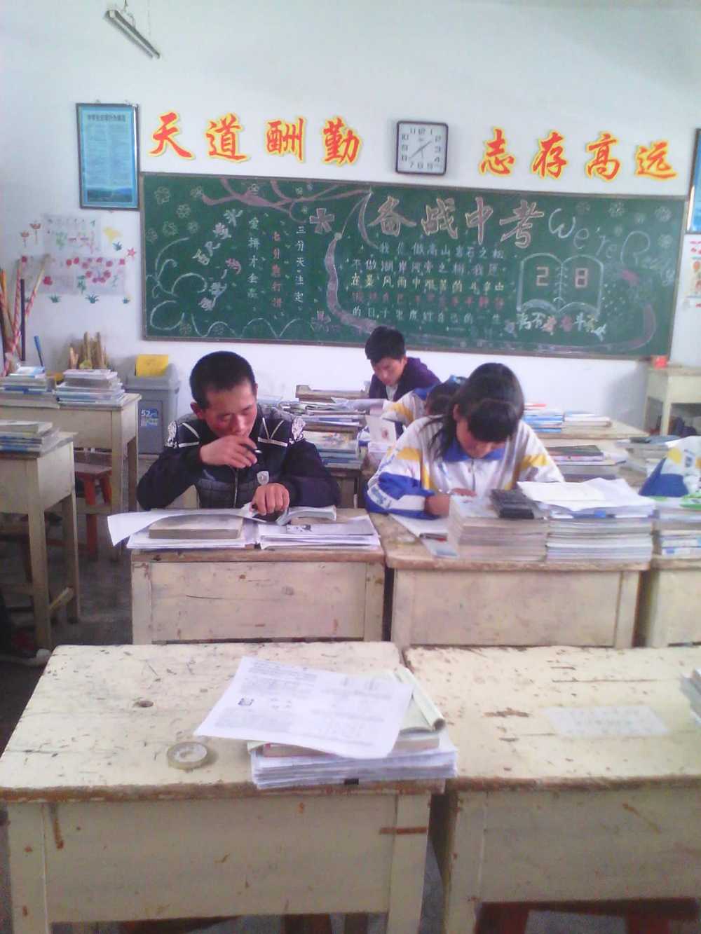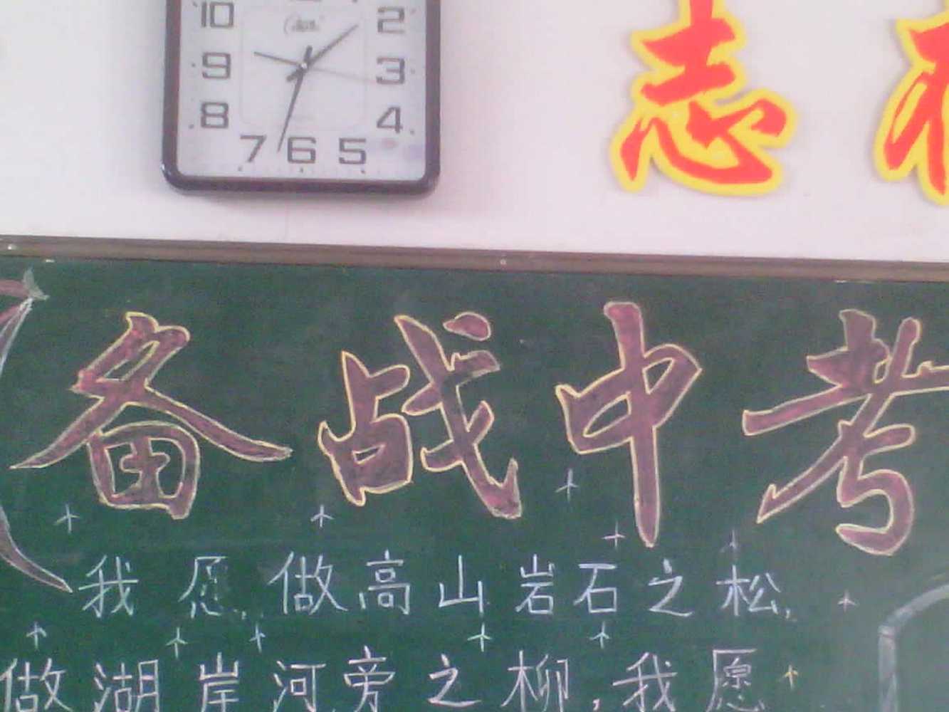 一路走来,三年的时光里,我们就像是一个整齐划一的队伍,然而半途中却不免有人掉队。这一学期,学校组织了黑板报比赛,同学们不约而同的提出,我们的黑板报应当以中考为核心于是赫然醒目的"备战中考"出现在黑板上,"中考倒计时"的安全也没有落下,同学们的玩心少了,取而代之的是爬到无穷的题海中。。。。。。。。。。。。