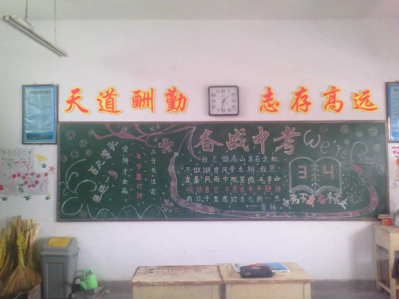 一路走来,三年的时光里,我们就像是一个整齐划一的队伍,然而半途中却不免有人掉队。这一学期,学校组织了黑板报比赛,同学们不约而同的提出,我们的黑板报应当以中考为核心,于是赫然醒目的"备战中考"出现在黑板上,"中考倒计时"的安全警钟时刻敲响,同学们的贪玩之心少了,取而代之的是爬到无穷的题海中······
