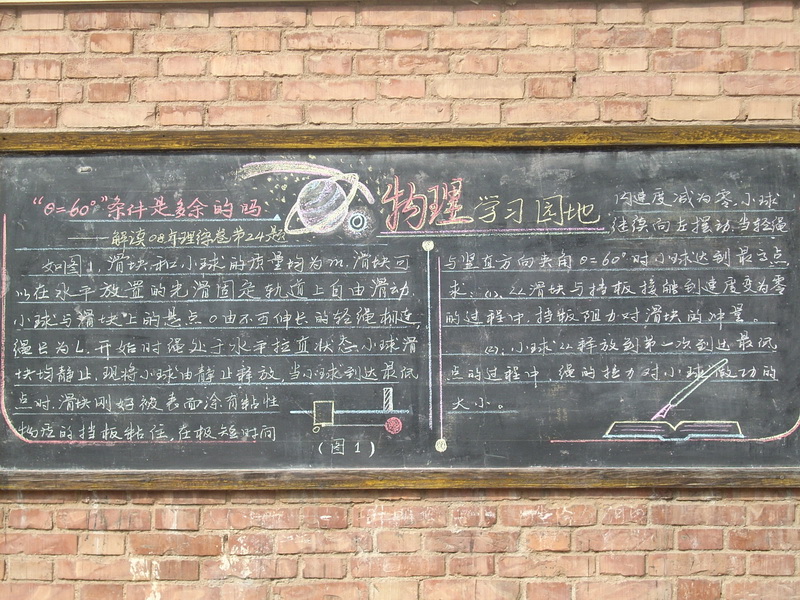 学校有很多室外板报,已经分配给各个班级,以前每个班级都是按照学校的要求,定期出一期板报,一般情况下,主题都是自己决定,所以,看起来,校园里的黑板报版式各种各样,内容也是五花八门,让人看起来觉得很杂乱.