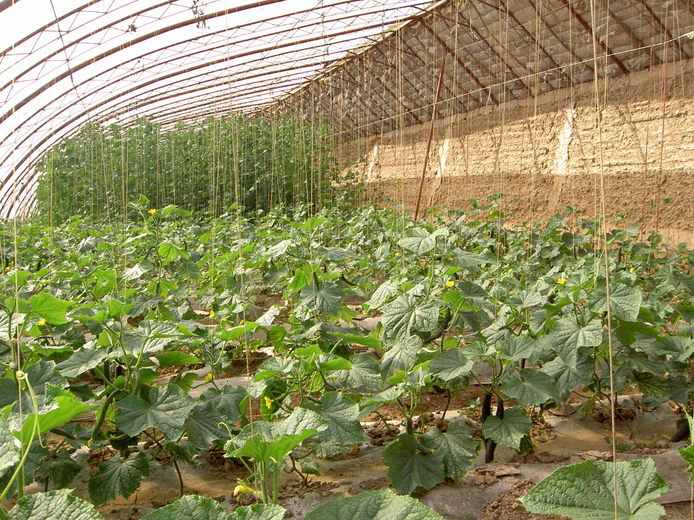在每年的冬春两季,蔬菜很紧张,利用塑料大棚种出的蔬菜在这两个季节经济效益很高。这些黄瓜叫做"地膜黄瓜",这样做可以保湿,也不用除草这吊着的长长的线是用来扶正黄瓜秧苗的。远处顶住棚顶的是豆角,其实温棚里还可以种像西红柿、茄子,辣椒等蔬菜呢,一年四季都可以种植。看,长势不错吧?