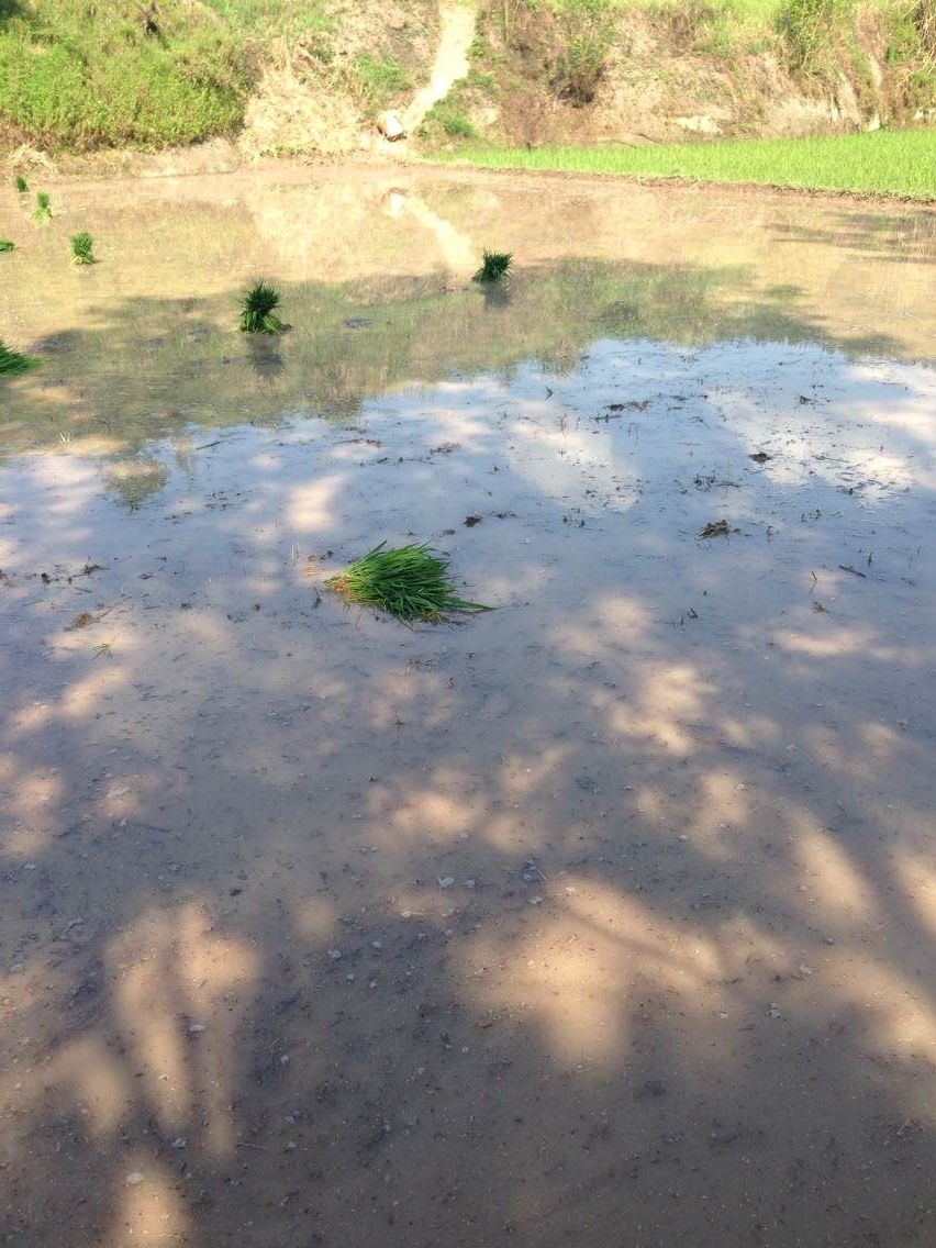 水田里,随处可见扎成堆得秧苗,他们将秧扎成一捆一捆的,扔在水田的各个角落。当人们需要时就会将一捆一捆的秧拆开,拿着秧插入水中,他们将秧捆成一堆,是便于插秧时的方便。