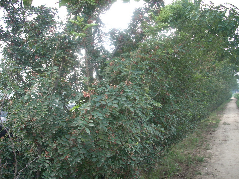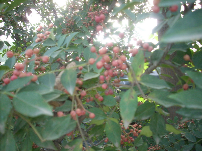 我们这里的村民一般都在自家果园的四周栽有花椒树.火红的八月正是大红袍花椒成熟的季节,人们到了摘花椒的时候了.