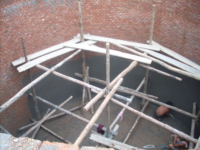 这里正在建造一个水池,这个水池可真大呀!直径大约4米,深度大约5米.望下一看,可真吓人啊.工人已经用砖砌好,现在正在粉刷.这么大的一个水池子,能储存多少水呢?我根据学过的数学知识简单算了一下,大约15000升呢。我在寻思着,他们建这么大的水池用来干什么用呢?
