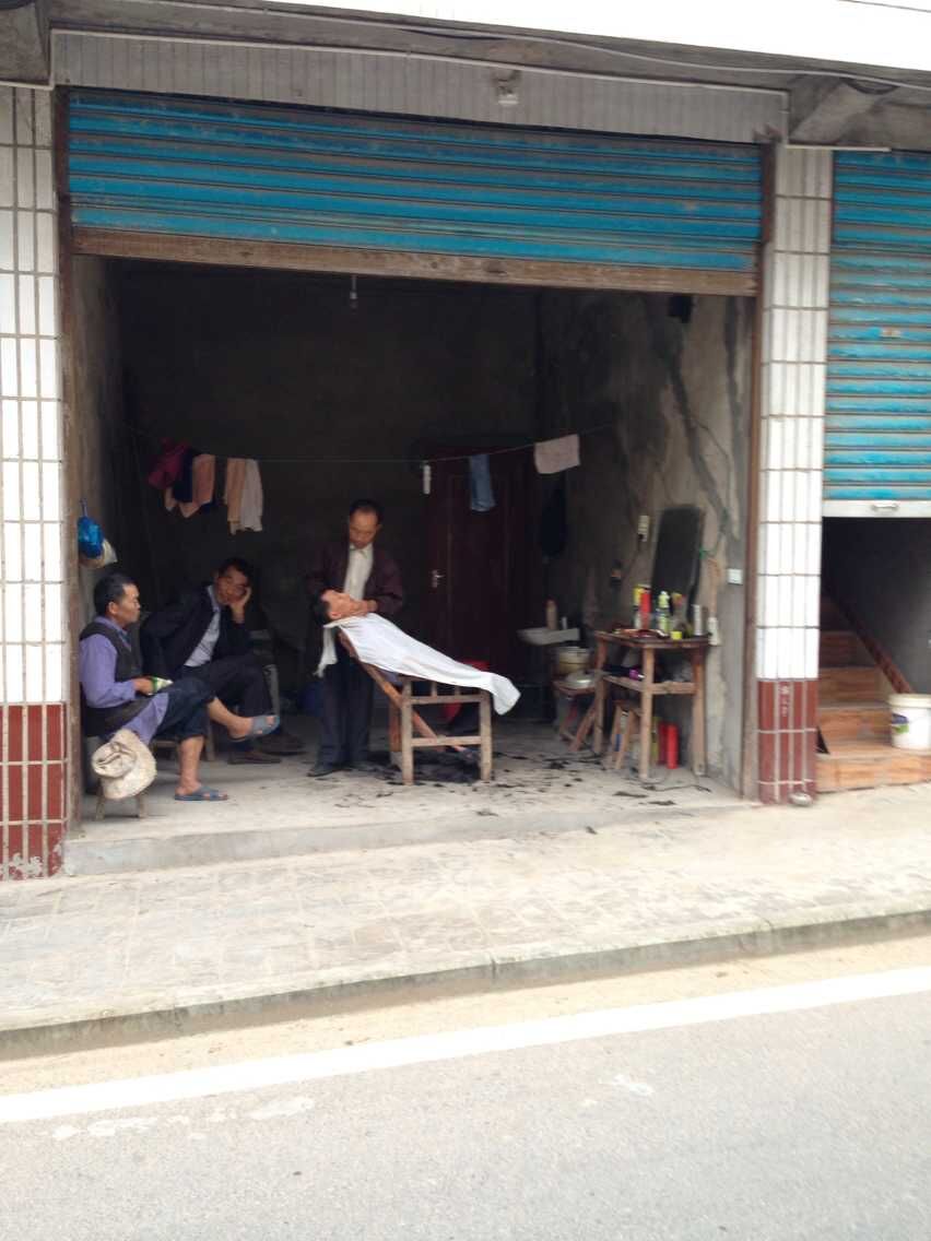 走出小巷,远处有一家理发店吸引了我的眼球,一位老伯正在为另一位老伯理头发,而旁边几位老伯坐在那里有说有笑,这个理发店装修十分简单,只有一面历史悠久的镜子,还有一张座椅,几把剪刀。