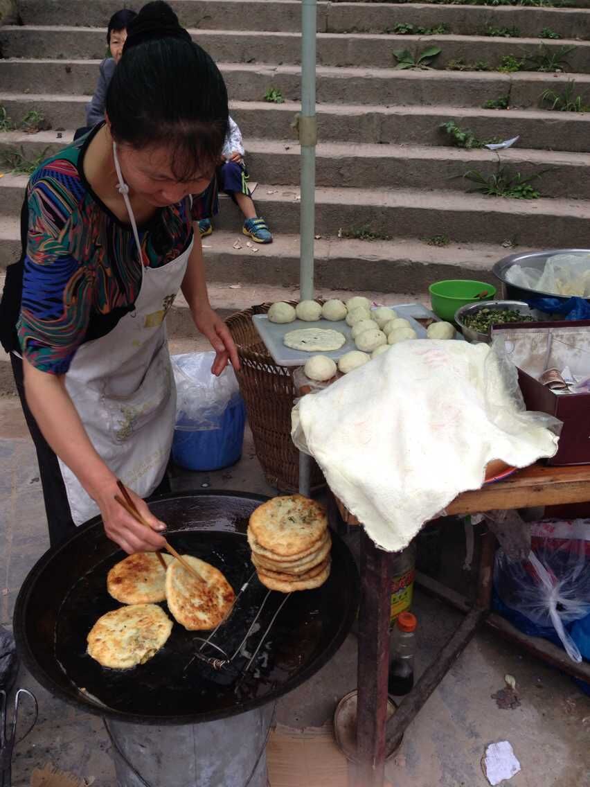 最受欢迎的应该是这个只卖一元的油饼了吧!每到当场天,这位阿姨便会早早地在这里卖油饼,买饼的人也很多。她弄得油饼,我们都吃得很放心,油是菜籽油,面是自家种出来,菜也是从农民那里买来的。