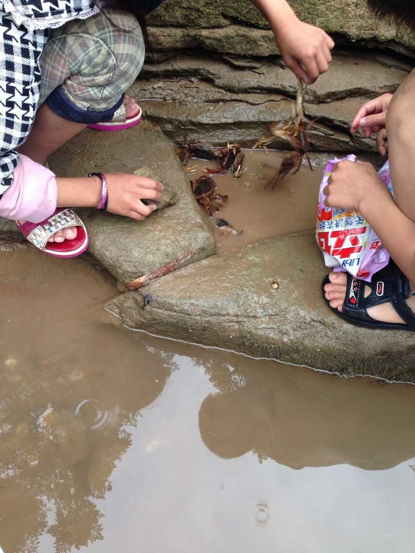 我们将捉来的全部倒在一起,在里面挑选出小螃蟹,然后放走它们,它们太小了,不好玩,然后将那些大个的螃蟹留在水洼里,每人分几只。