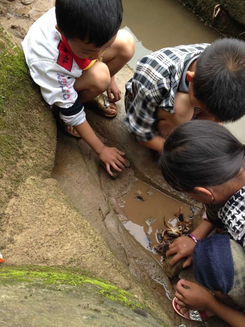 我们的童年,是否都在小溪里翻找过河蚌,是否都捉过小鱼,是否都被大螃蟹夹过。那时候我们跟他们一样,几个小伙伴一起,在小河沟里,摸鱼,在大石块下找螃蟹。