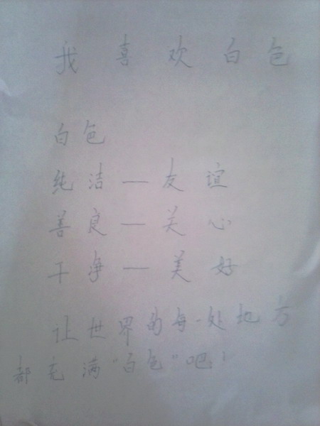 圣洁的白色啊,是你教会我如何做纯洁的人;干净无暇的白色啊,是你告诉我不进自己要做一个干净的人,还要帮助身边的人做一个干净的社会好公民!你将永远都是我心中最艳丽的颜色!