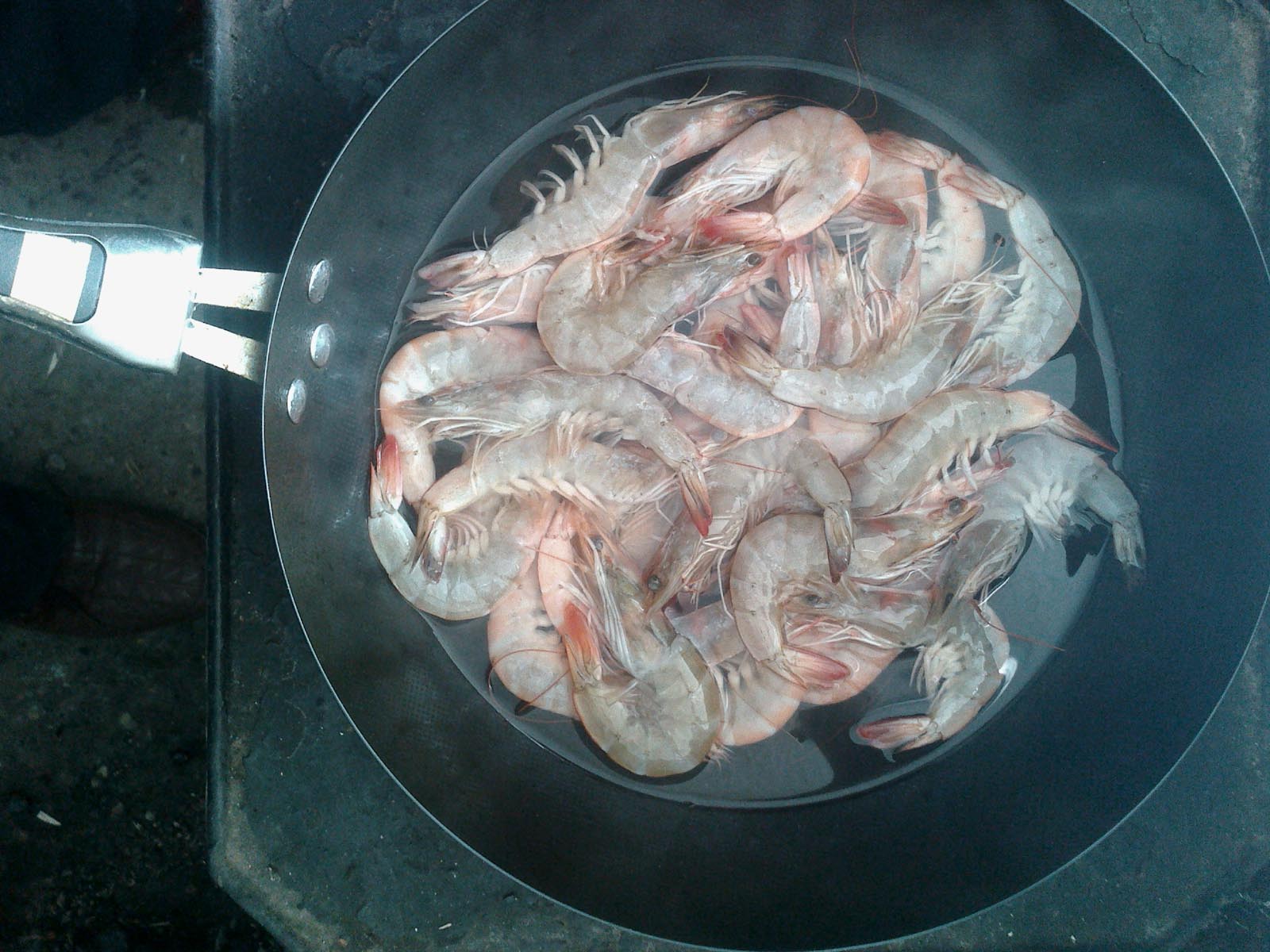奶奶不会做,就是锅里倒上水,加了点盐。把虾倒进锅里煮,等水烧开了,奇迹出现了。只见一个个灰黑色的虾慢慢地转变着颜色,先是一面发黄发红,然后遍及全身,最后都成了红黄色的。这样的颜色看起来好有食欲啊。