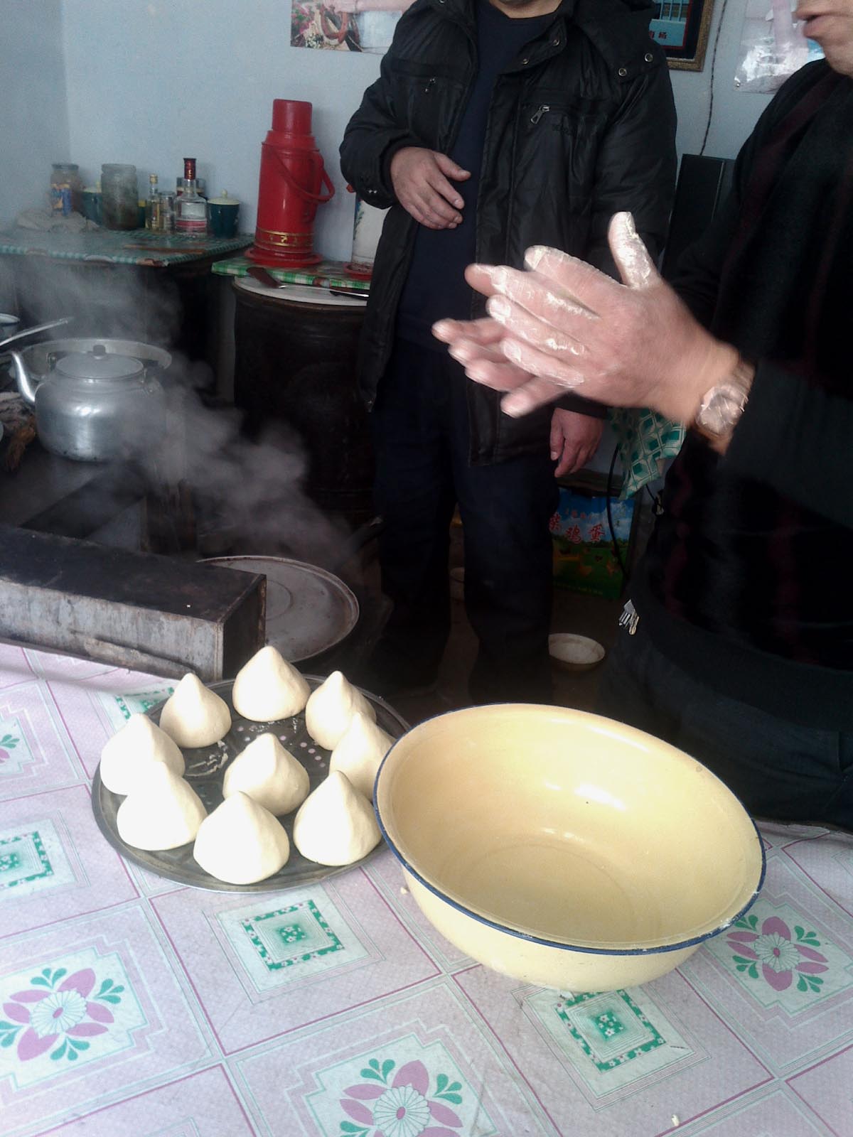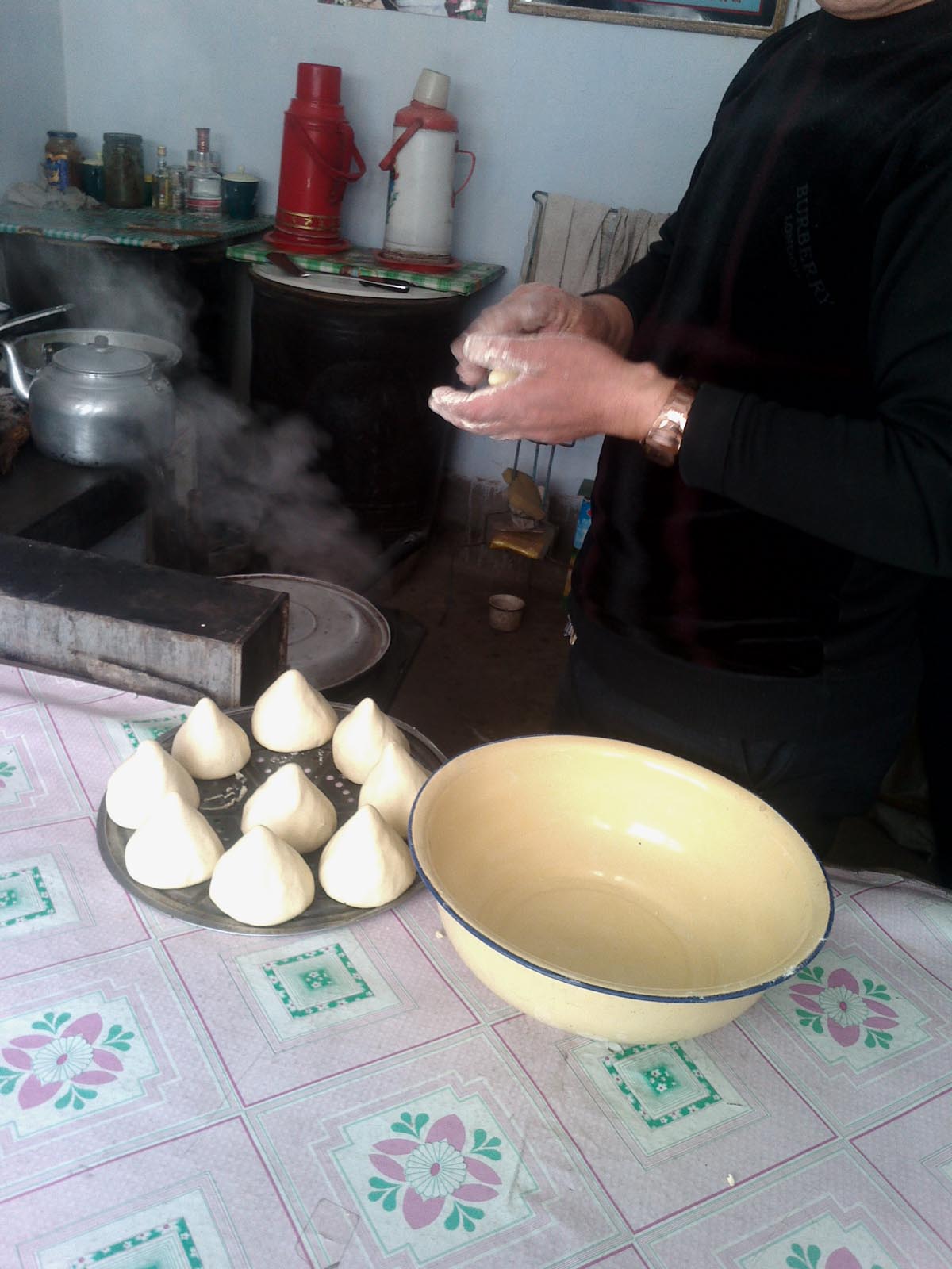 然后就是技术活了,用和好的糕面捏成一个个窝窝,中间空,四壁及顶端的厚度要一致,薄一些才好熟。也不能太薄了,否则蒸熟就塌陷了。大爷蒸窝窝的技术可是一绝,捏的时候什么样儿,蒸出来就是什么样子,既劲道又薄又好吃。