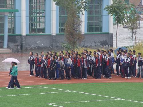 运动会开幕式刚刚开始不久,天空中就飘起了绵绵细雨,尽管雨很小,马上就湿透了衣服,地面也湿漉漉的。但是开幕式还是在雨中顺利进行。