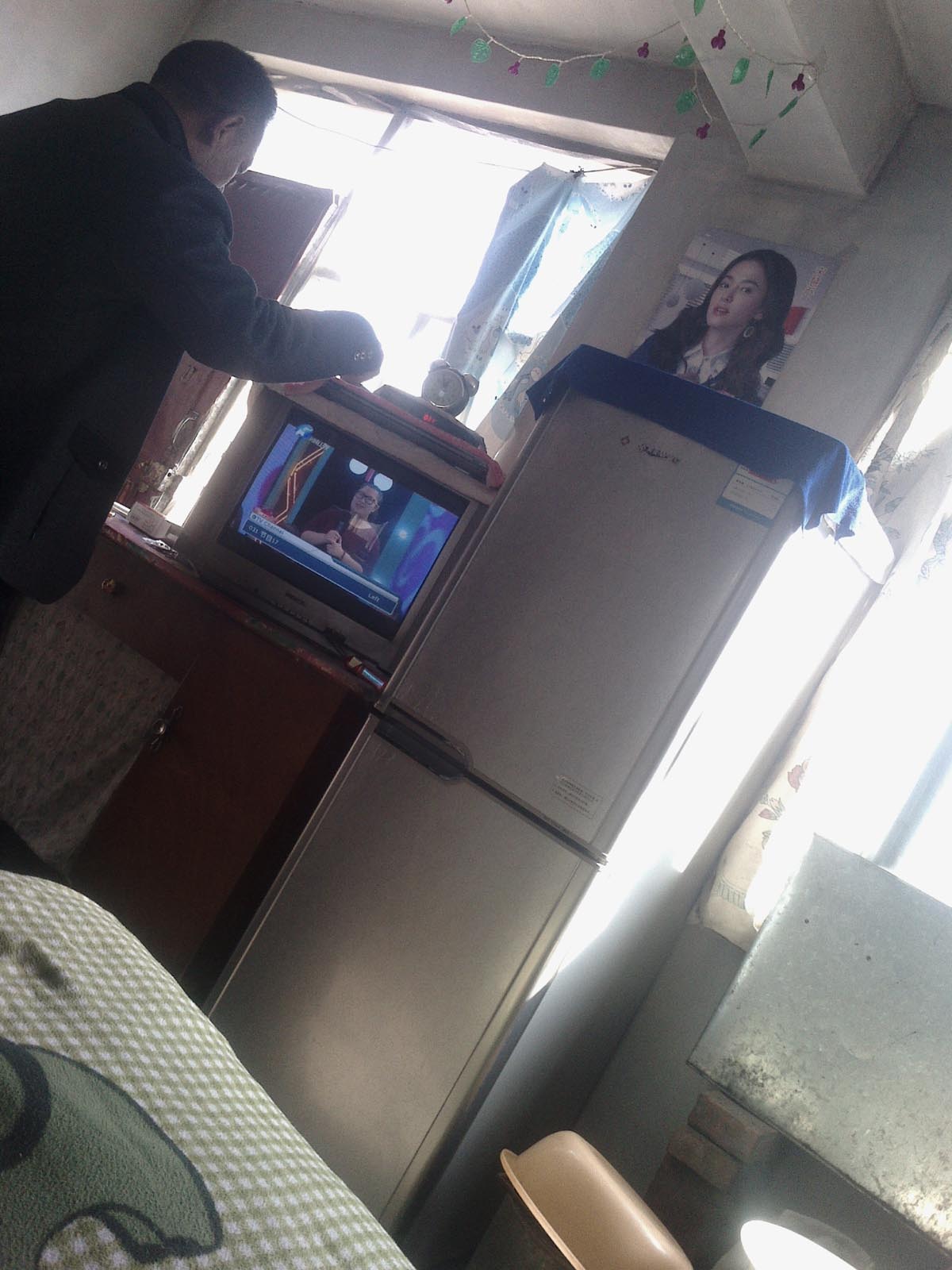 大爷的家不大,就是一大间屋子,屋子里摆得满满当当的,一张双人床,还有一张上下铺床,就把屋子占了一大半。前面摆着电视机和冰箱,空余的地方放着摩托,就再没地方了。好在大爷是一个人过日子,也不显得挤。