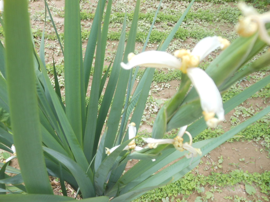 我走进花园,发现了一簇绿色的植物。走近一看:一团绿中有几颗青雪色的花,共五朵,每一朵的花瓣组成一个三角形。有的亭亭玉立,娇嫩细小,有的身子宽大,像个守护神。而大多数则是叶子,长长的宽宽的,摸起来很柔韧,用手翻开,很是粗壮。