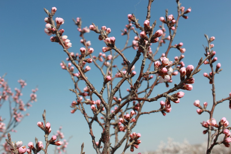 我一步步地向着茂密的杏树林进发。走近才发现,杏树长得毫无规律可言,只是肆意地向外伸展开来。那些淡粉色的小花则小心翼翼地挂在枝头上供人们欣赏,杏花开得千篇一律,都是小白花上留下淡淡粉色,只是一些还是小花苞,有的花却早已调谢。