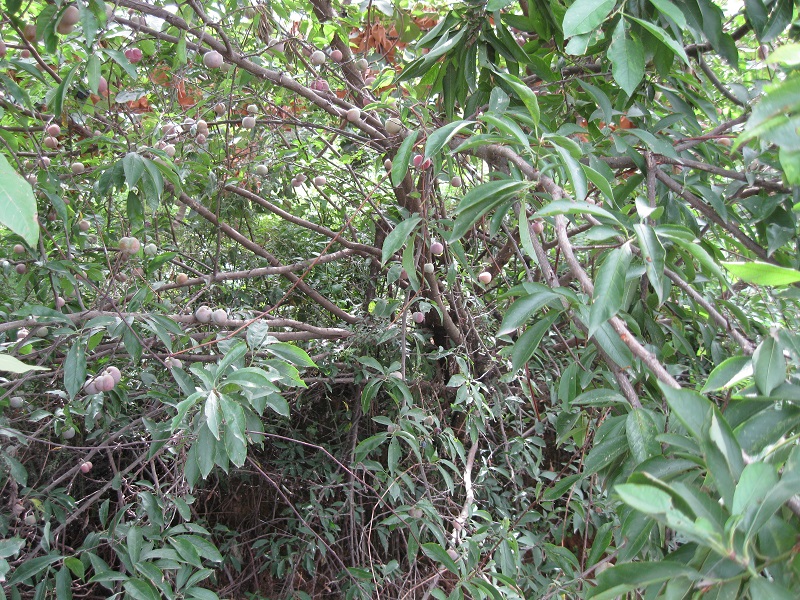 我家的李子在沟边上,这样更使李子的道理一个天然的生长的环境,沟里的水清澈见底,记得,小时候也会在沟里嬉戏打闹。一树子的李子,有红又大,挂满了一树,远看着就像一个个小灯笼,枝繁叶茂,绿油油的一片,看上去犹如一把绿伞。