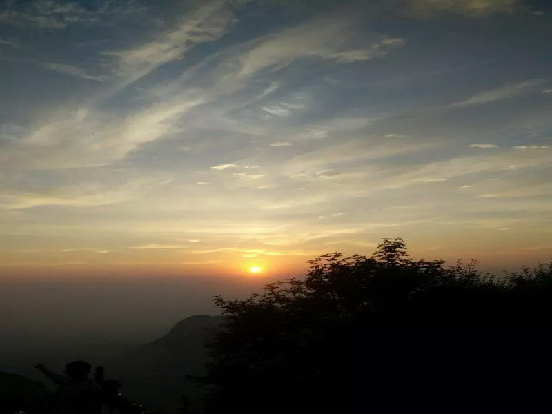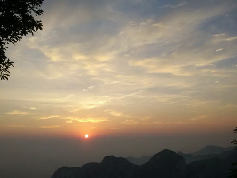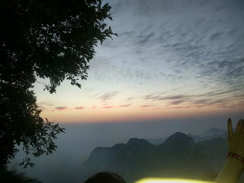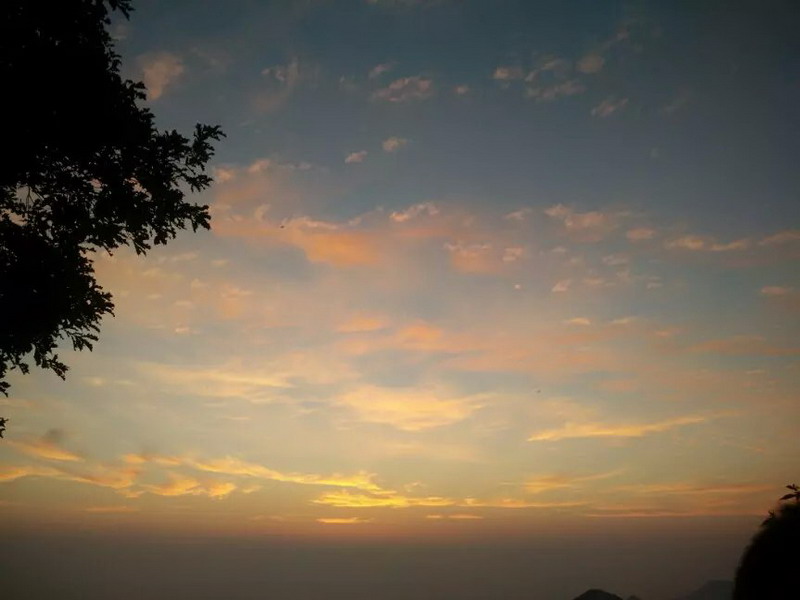 天刚破晓,淡蓝色的天空还镶嵌着几颗稀稀落落的星星。我睡眼惺忪地洗漱,梳头,又急匆匆的拿起照相机,穿过茂密的树林,越过清澈的小溪,走过泥泞的山路,终于登上家乡的大山,等待着向往以久的日出。 夜色像一条无边无际的纱布笼罩着天空,天边出现了一道道白森森的光,就像一条丝带,萦绕着远处雄伟的山峰。渐渐的,渐渐的,启明星在不知不觉中悄悄的离开了。公鸡不停的叫着"咯咯咯,咯咯咯"好象在演奏欢迎太阳的乐曲。不一会儿,太阳公公伸了个懒腰,缓慢得升起,几缕红光迫不及待的从海天相连处射出,穿透云层,指向天边。雾气散去了一些,我们的脸被照的通红,活像一个猴子的屁股。绿叶变成了枫叶,火红的太阳悄声无息地探出了一点点脑袋,静静地,像是怕吵醒了睡梦中的山。梦幻般的红光洒在云朵上,为云朵染上了红胭脂。瞧,云姑娘一边的脸颊火红火红的了,但那火红依旧藏着一丝神秘与梦幻。少顷,一片云掩住了太阳的脸部,就像一位害羞的女孩偷偷地用纱巾裹着自己羞红的脸似的。橙红色的云层隐藏的金光淡了下来,于是地面缓缓流淌起雾蔼来。