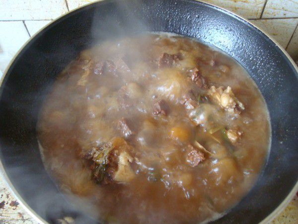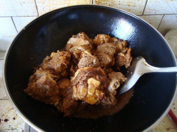 洗完后,我在锅里倒了一些油和盐,把骨头倒在锅里,炒了一会儿,然后又倒了一点点水在锅里。煮啊煮啊,煮到熟的一定程度时,我又把冬瓜倒在了锅里。过了一段时间我又在锅里倒了盐,放了些辣椒。等啊等啊,过了一会儿,一锅香飘十里的红烧排骨就出炉了。我用一个大盘子把排骨铲在了盘子里,然后又舀了三碗饭,终于可以开饭了,我们一起吃得很开心。