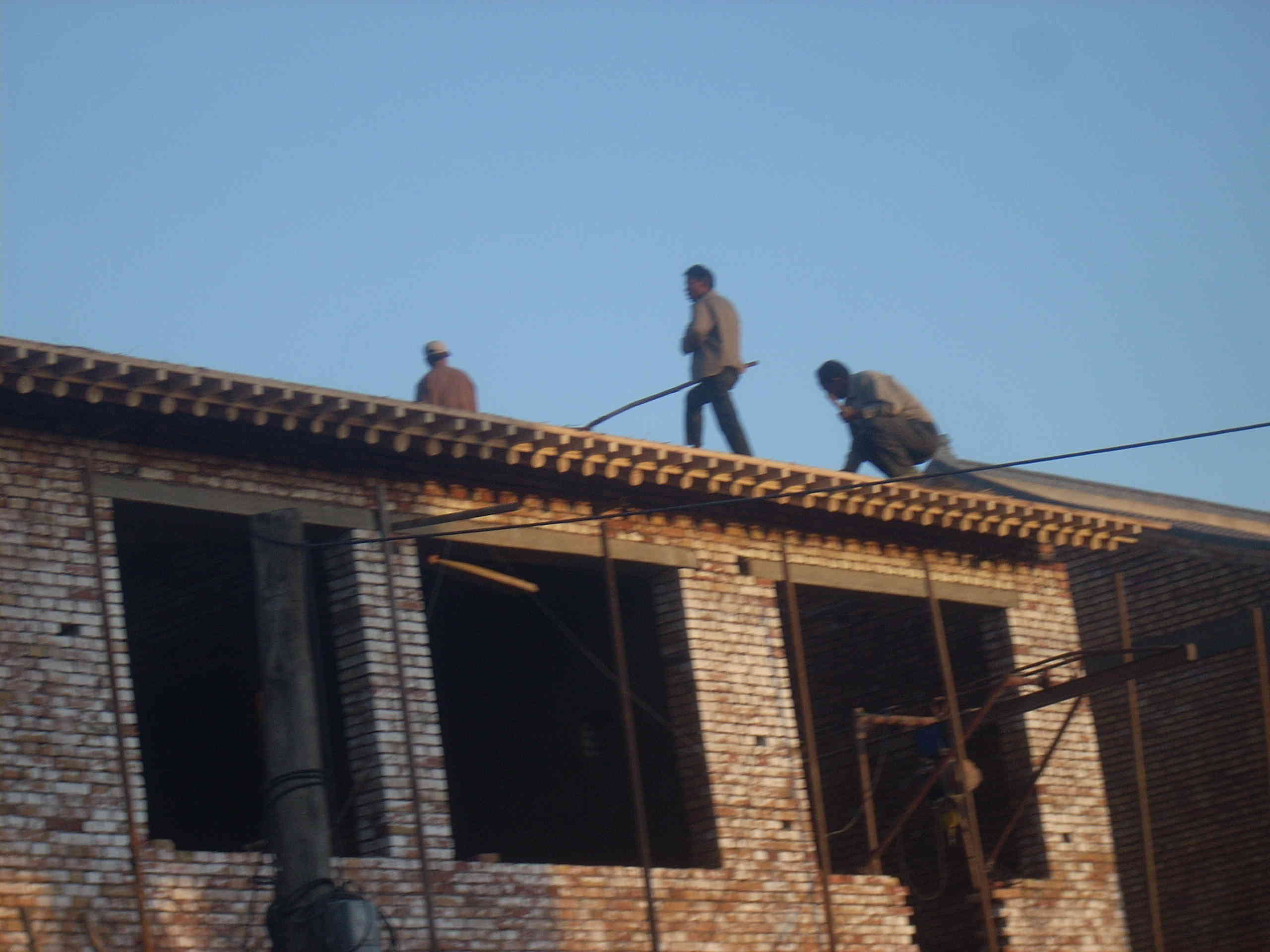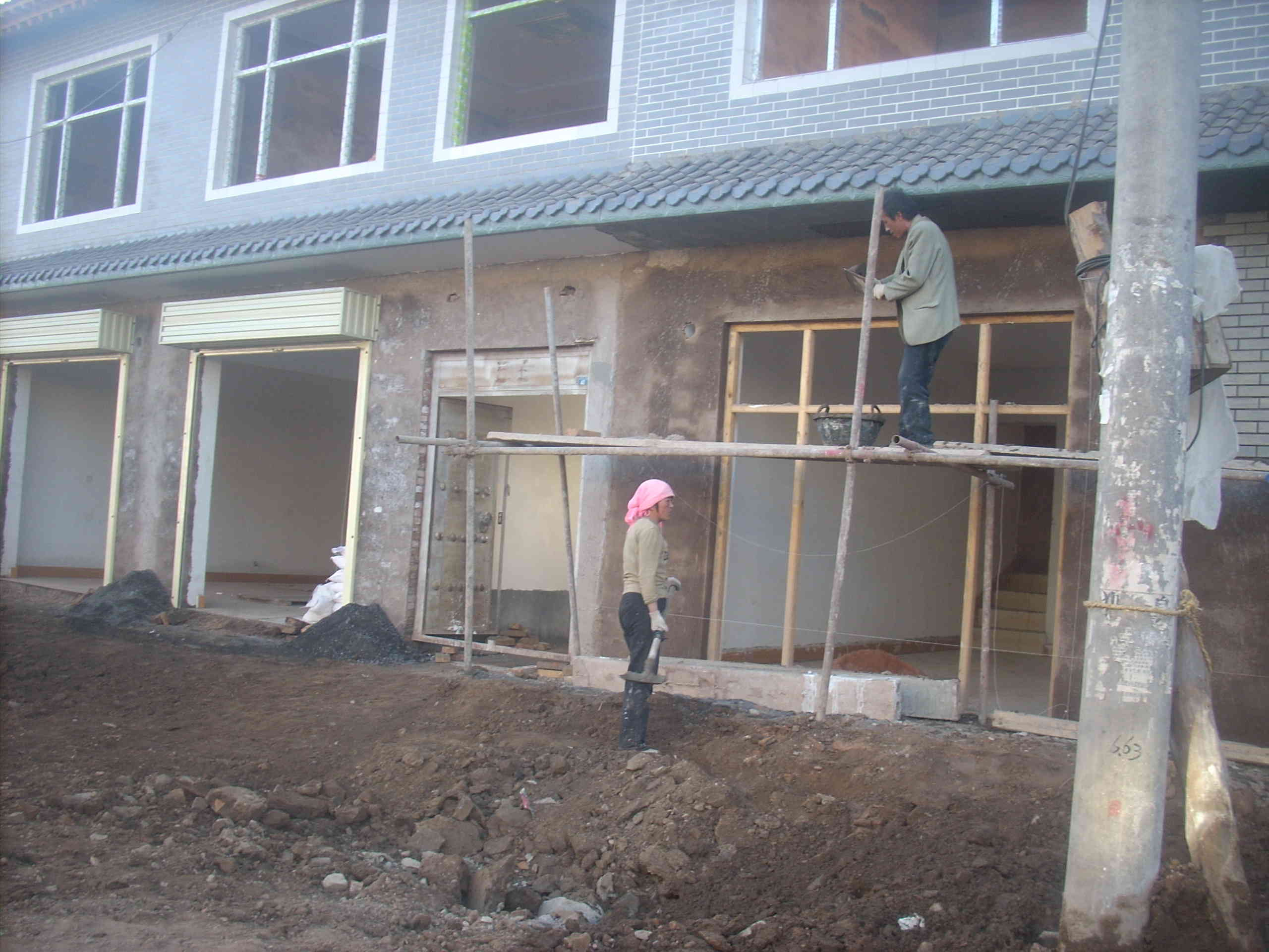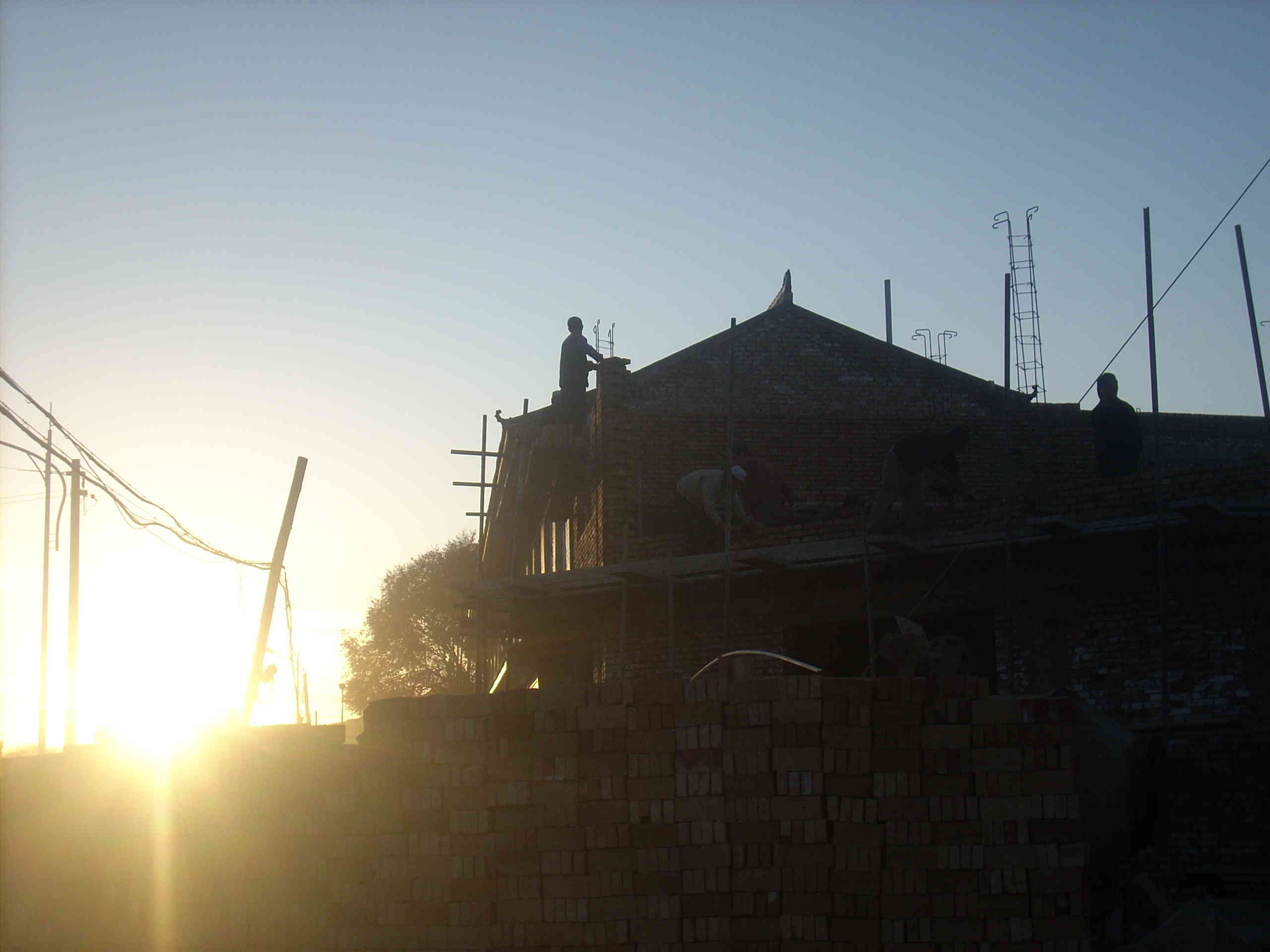 层层的脚手架,坚定的扶持着这新生的建筑,几个黑色的小点在脚手架上缓缓下移,渐渐变大,长成模糊而高大的身影。