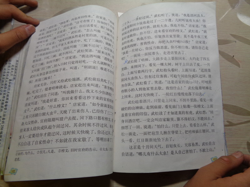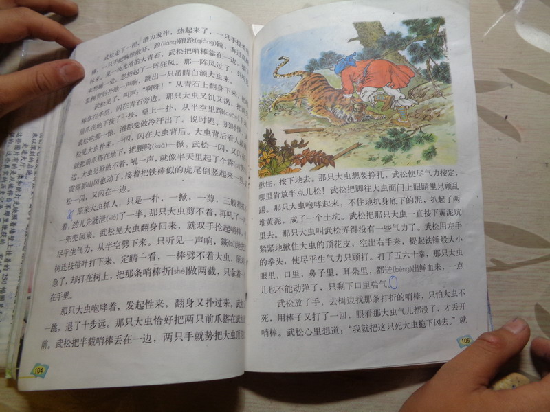 一天,武松赶路来到了景阳冈脚下。他走进酒店 ,较小而那就和牛肉来。之后,硬要上冈也不听小二的劝告,一连喝了18碗酒走上了景阳冈。