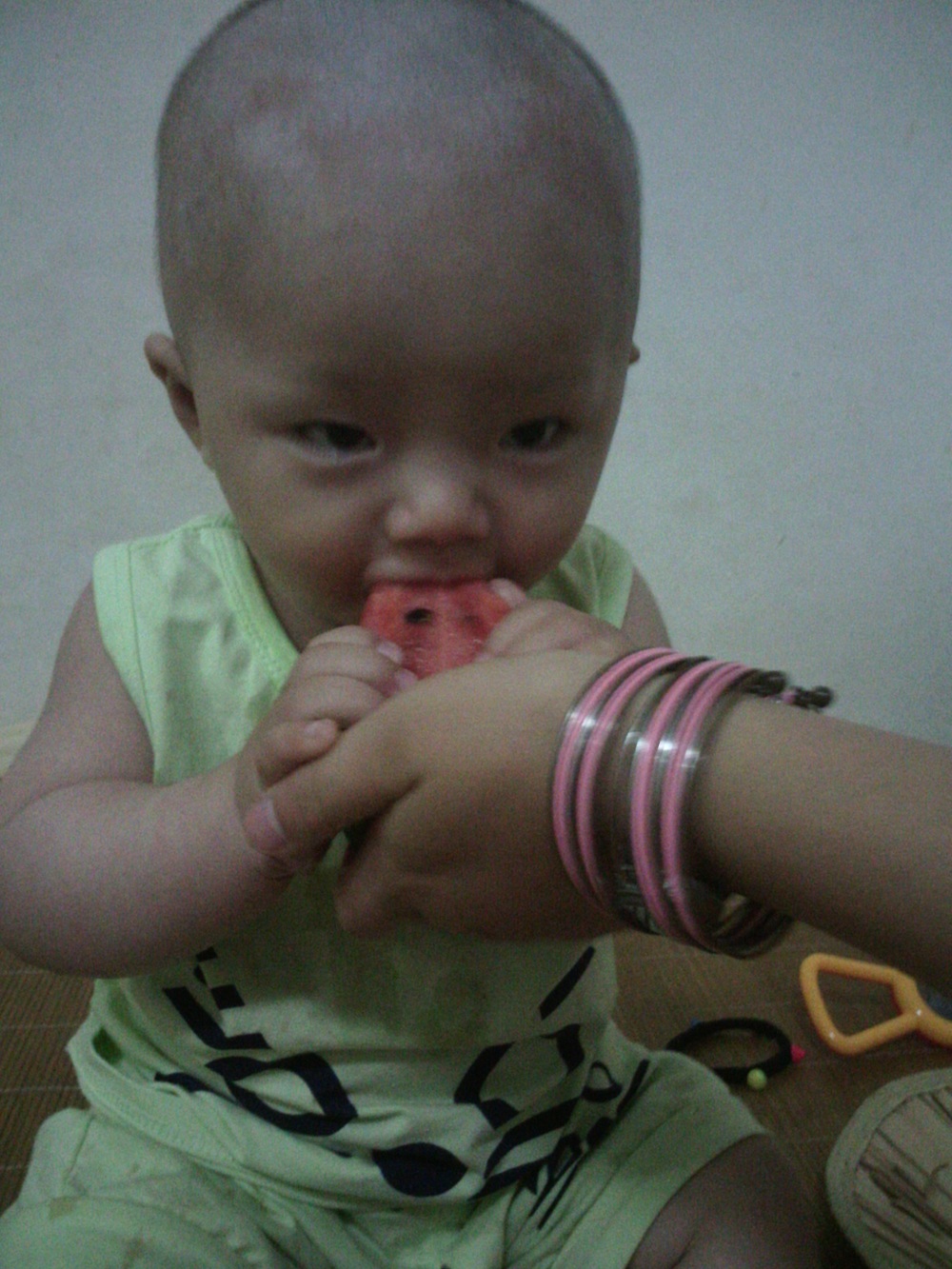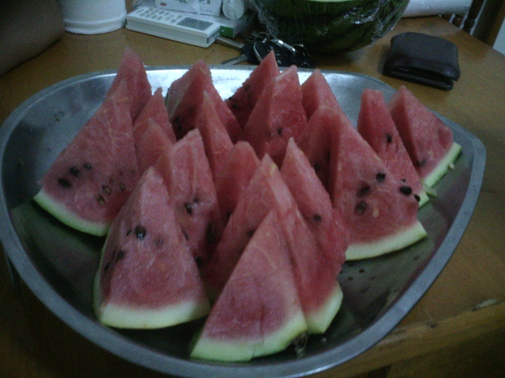 这个西瓜圆圆的外形,拍起来嘭嘭作响,绿绿的外皮,还有黑色的纹路遍布全身,看起来让人凉意俱生。切开西瓜后,是红红的内壤,上面镶嵌着黑色的籽。小时候,大人们总是善意地欺骗我们道,不要把西瓜籽吃进去了,不然会从肚子里长出西瓜苗来,以后还会长出大西瓜来,我们竟然傻傻的相信了,吃得时候特别小心,生怕把西瓜籽吃进去了,现在才知道,大人们是想让我们吃慢一点,不要呛着了。