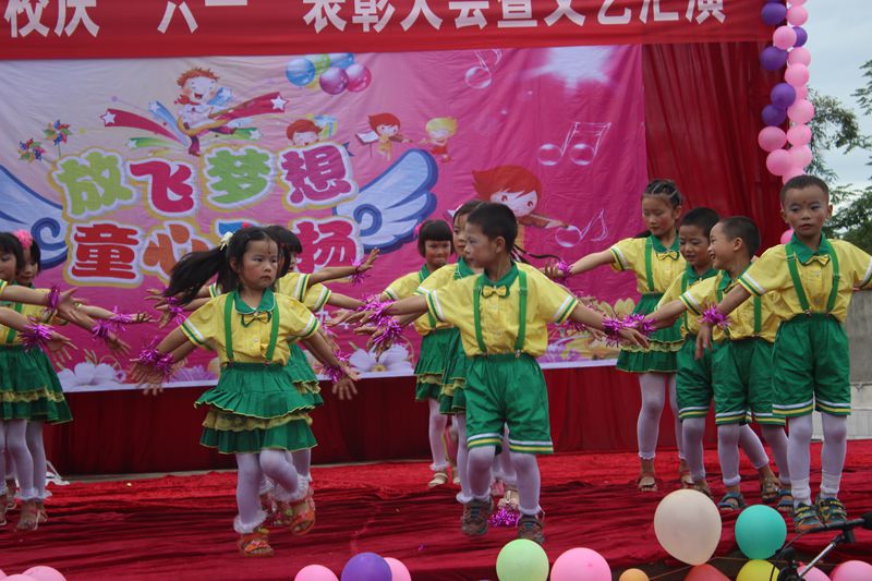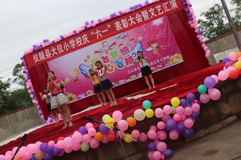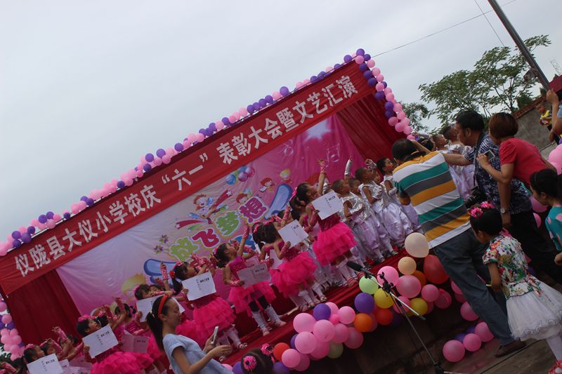 进入小学,映入眼帘的是一个石砌的舞台,台后面挂着红色的幕布,幕布的四周及舞台台沿都挂着五颜六色的气球。我们来到指定的位置坐下,等待着庆祝活动开始。