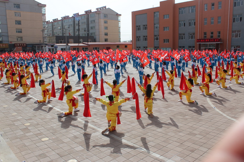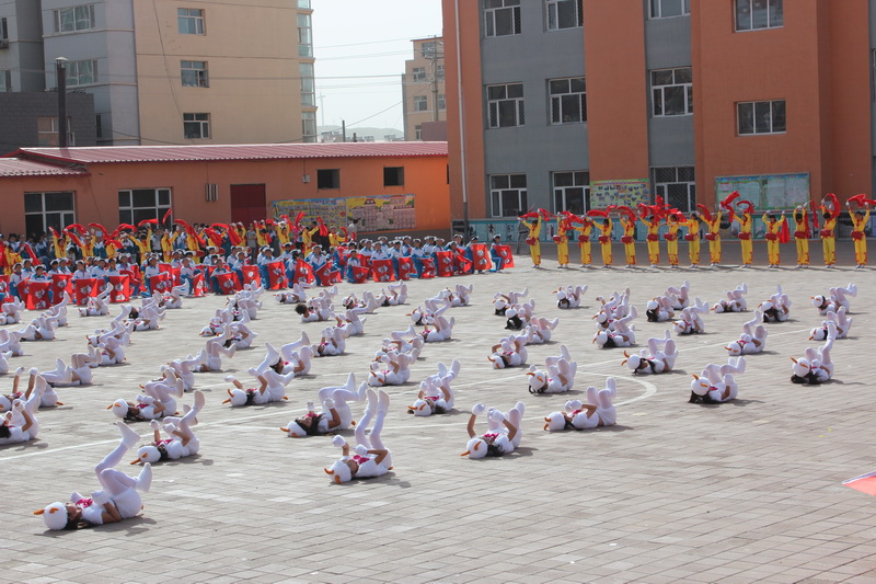 我们早早地来到学校,得到老师通知,我们全班下了楼。之后,我们分别站在左右两边,大型节目开始了。只听音乐响起,许多同学整齐地排好队。伴随着音乐,他们打腰鼓的动作附和着音乐,使我们看得入了迷。接下来,一群同学举着旗子向中间跑去,音乐声一响,他们便跳了起来。最后一个是一群身着小羊装的同学们摆着手跑过来,她们扭着身子,在操场中央跑来跑去。