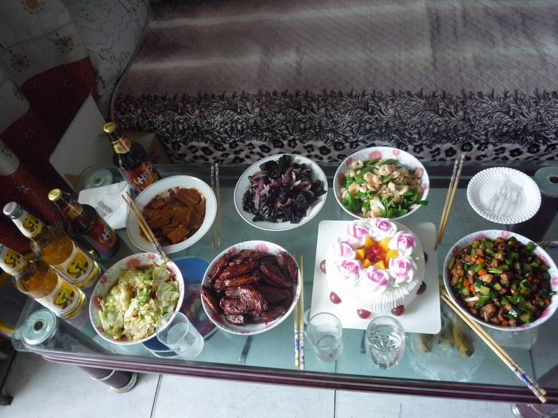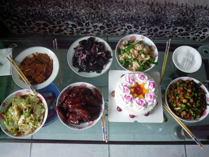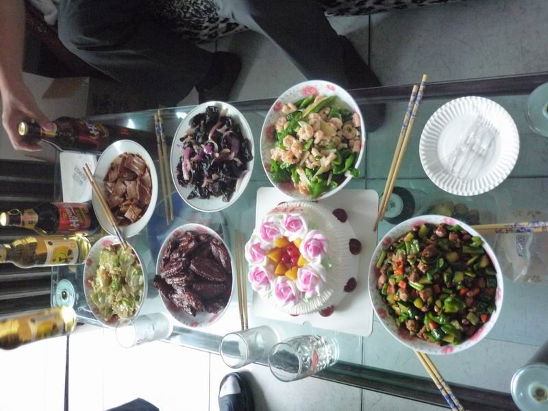 妈妈从一大早就开始收拾家务,而后和爸爸去取了蛋糕,买了菜。到了下午一直都在厨房准备晚饭。晚上我们请来了关系好的几位亲朋好友与我们共进晚餐。晚餐很丰盛,有虾、有鸡、还有手撕莲花菜等可口美味的佳肴。大家都非常高兴,吃的也非常好。看得出来,爸爸妈妈很激动。最后,大家在一起打牌,晚上十点多才散。