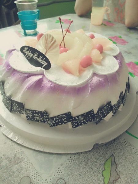 这个事我的好朋友李庆伟给他准备的生日蛋糕,上面还写着他的名字,因为他的幸运颜色是紫色,所以蛋糕的颜色有由紫色为主,上面的水果简单的拼成了生日快乐四个字,表达了我们对他的祝福。