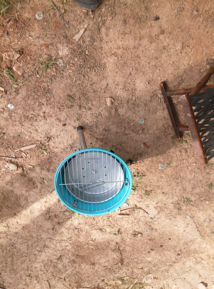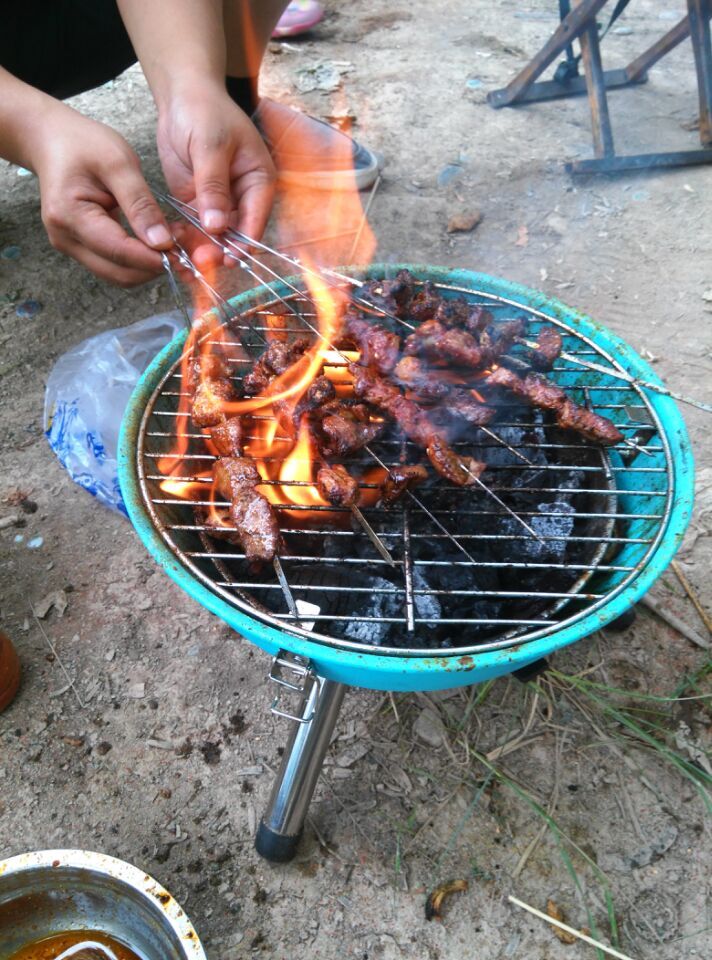 我们架好了炉子,点上了火,准备烧烤。刚开始我不敢烧,只拿了一串年糕在烤,果然我就被油溅到了。