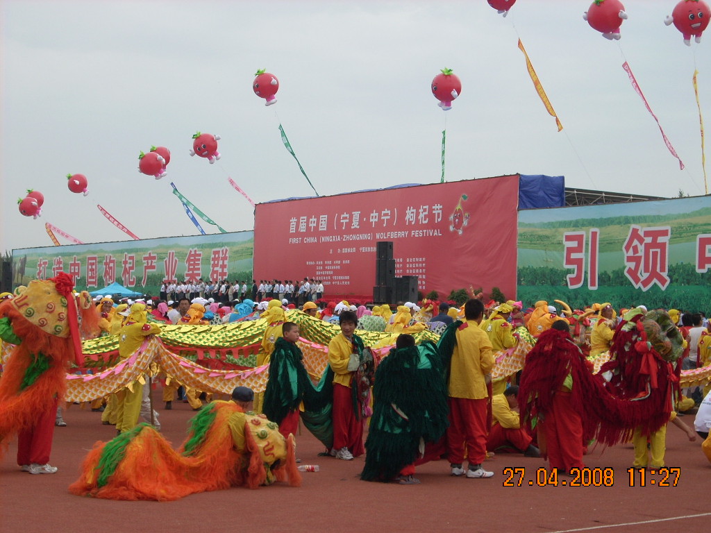 在开幕式上,各地派来了有自己特色的代表队。看!那穿着金黄色衣服的队伍,旁边放的是他们将要表演的舞龙,活灵活现,给人一种亢奋的精神。再向远处看去,枸杞娃娃笑盈盈的在舞动,蓝天也为这个盛会送来了它自己的祝贺……