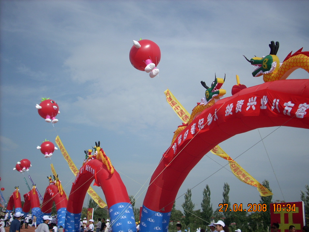 这里一片欢快,这里处处张显着节日的气氛。看!彩虹门在鼓风机的吹动下,屹立在走道之上。在阳光的照耀下,那红色越发显得美丽,一种喜庆的气氛也营造了出来。上面的标语充分体现了杞乡人民的生活及精神风貌。枸杞节,中宁人自己的节日,它会使枸杞走向全世界。