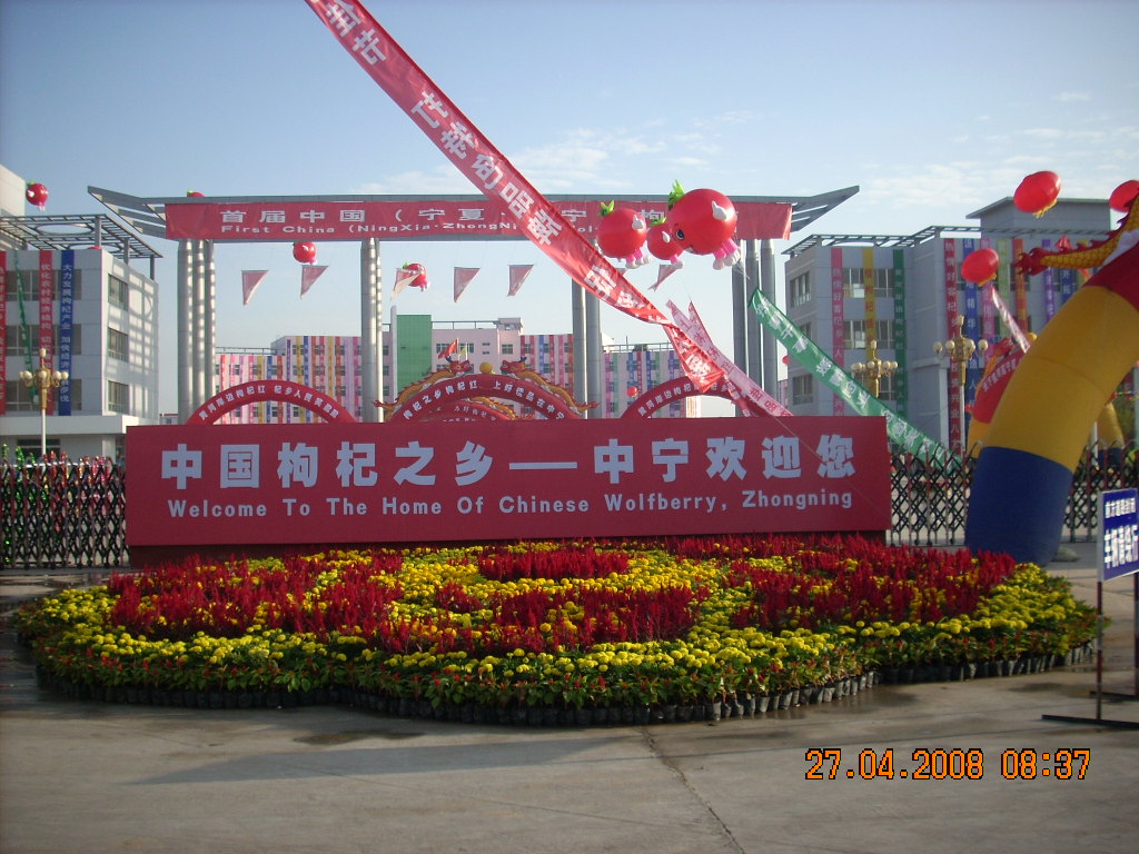 在红的、黄的、绿的……一盆盆花围成的美丽之上赫然写着"中国首届枸杞节"八个字样,标志着枸杞节的胜利召开。
