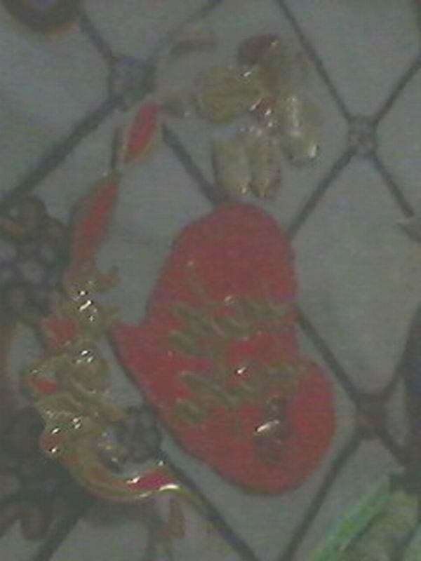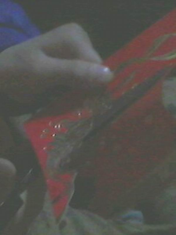 纸的左上角是那个喜字,喜字的旁边是那一对幸福甜蜜的小人儿,他们的右上角又是两颗绑在一起的心,这应该表示永结同心吧!右下角就是那个美丽的漂亮的花边,好看极了!我想给它镶个框,但又没有我需要的材料,所以就没有镶,我需要的材料现在可能几乎没有了,是什么呢?那就是粘住的一次性筷子。