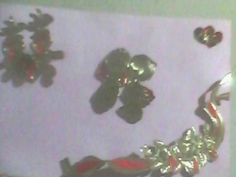 我先把好看的东西都剪了下来,剪了一个花边,一对小人,一个喜字,和一颗小小的"心"。病找到了一张粉红色的纸,设计好贴了上去。