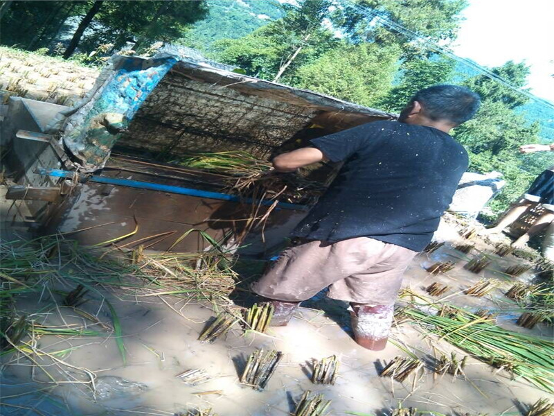 接下来就是打稻子了。随着科技的发展,聪明的人们为了方便农民发明了打谷机。我家也有一台打谷机。打谷机是像滚筒一样的,但上面还带着齿。打谷机还必须架在一个像"小船"一样的大盆里,因为这样稻子就可以直接打到大盆里在打包就行了。当然,还需要盖个"帽子"防止稻子再被打时飞出。然后就直接把整齐割好的稻子"喂"进去就行了。