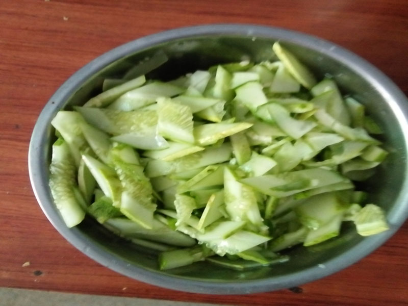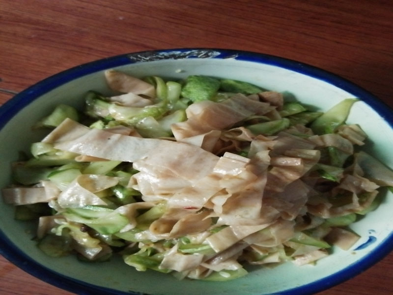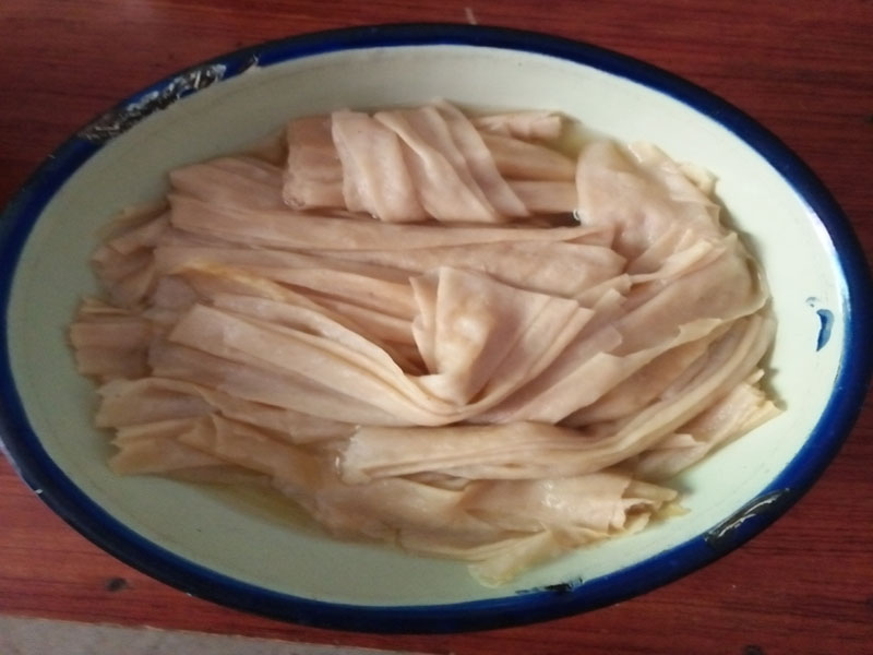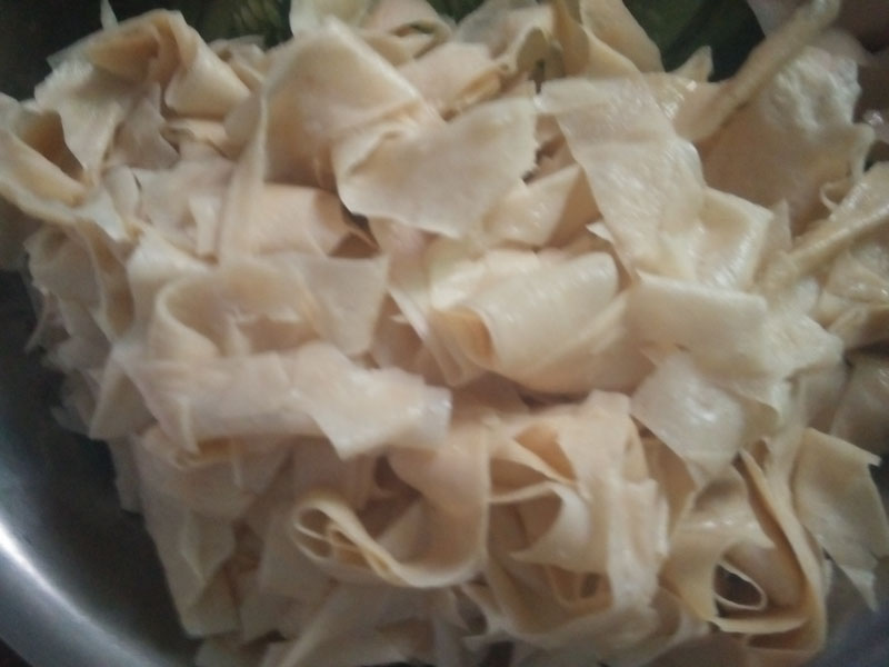 等到豆皮泡软了就可以切了,首先把热水倒了,在盆里加冷水把豆皮洗一下,防止豆皮里不干净,用手弄干;一张张的铺平切成一这款的长条,放入小盆里。