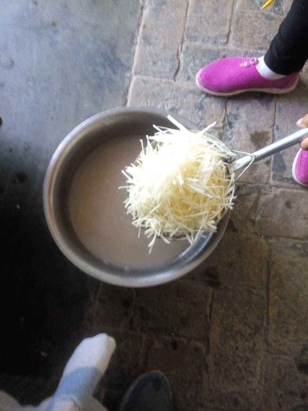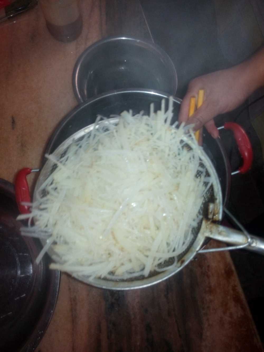 我把锅拿出来放到电磁炉上,接着把土豆切成丝。我往锅里倒上水,等到水沸腾之后,我把土豆丝放在水里煮。大概等了5-6分钟,土豆丝就煮好了。