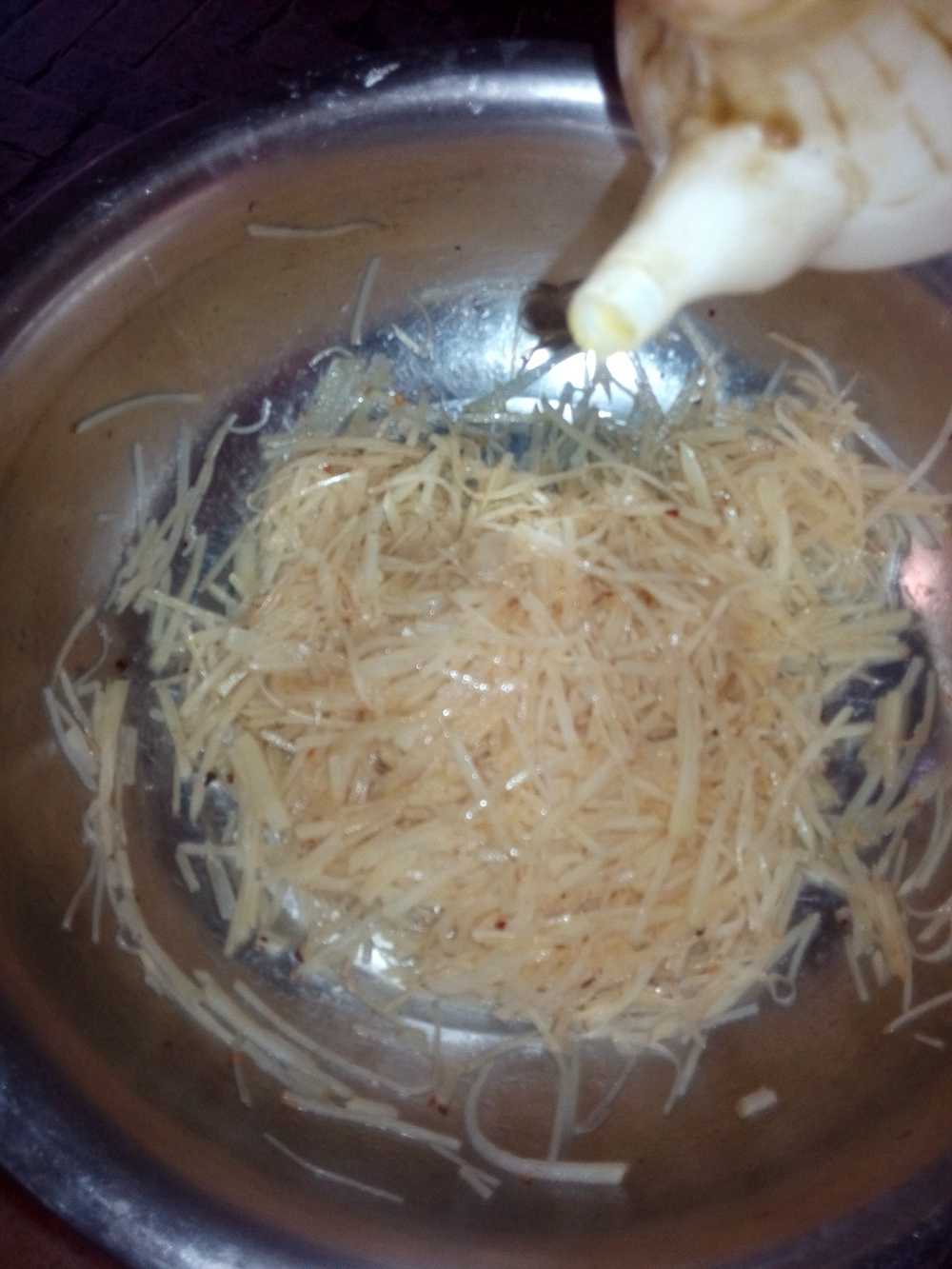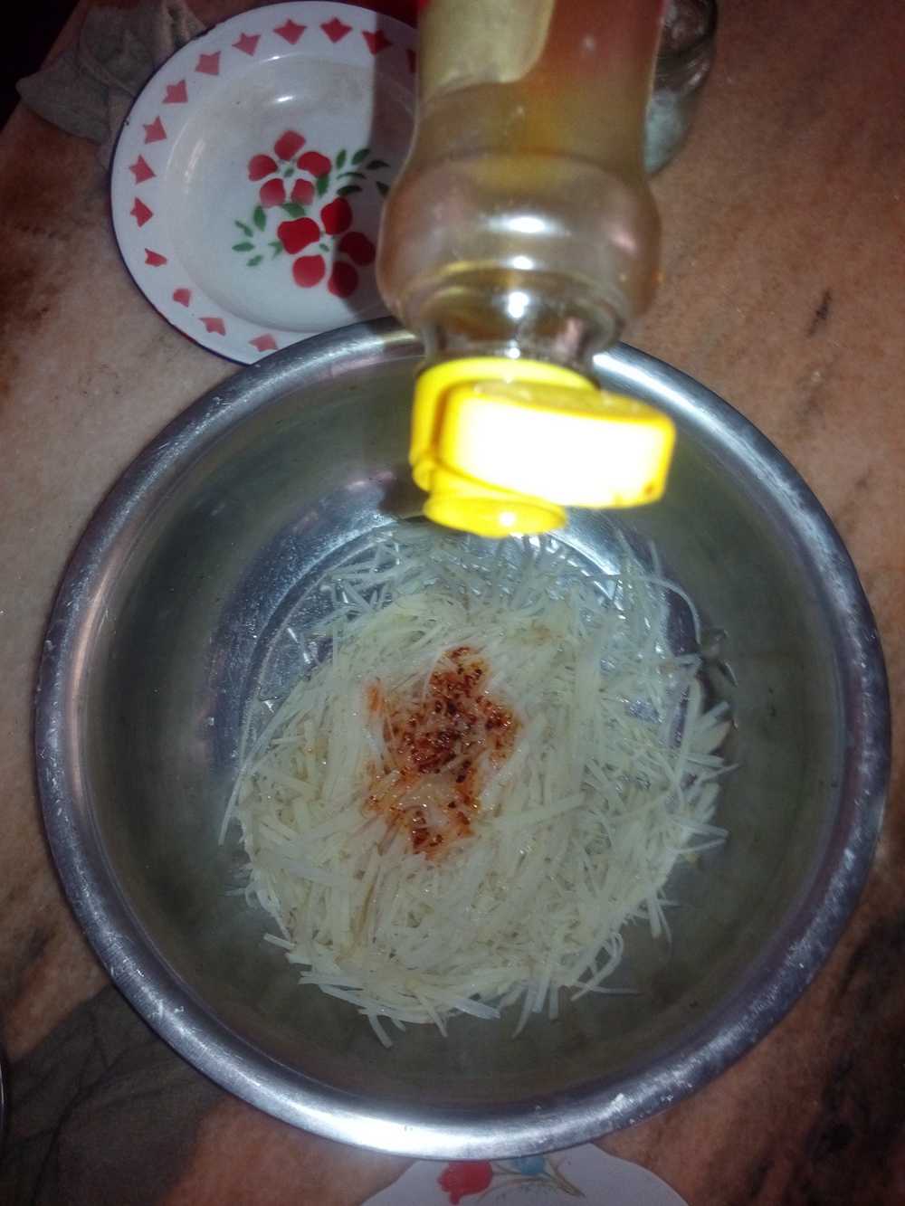 我把土豆丝放在一个盆里,然后我在锅里倒上油,油过好之后放入青椒和葱,把它们炒了两下之后,我把它们倒入土豆丝里。接着我放了辣子还有香油,就这样一道家乡菜就在我的手里诞生了。