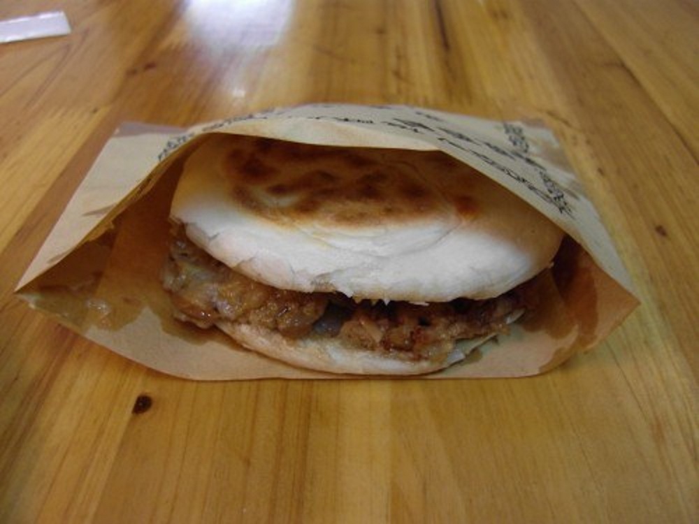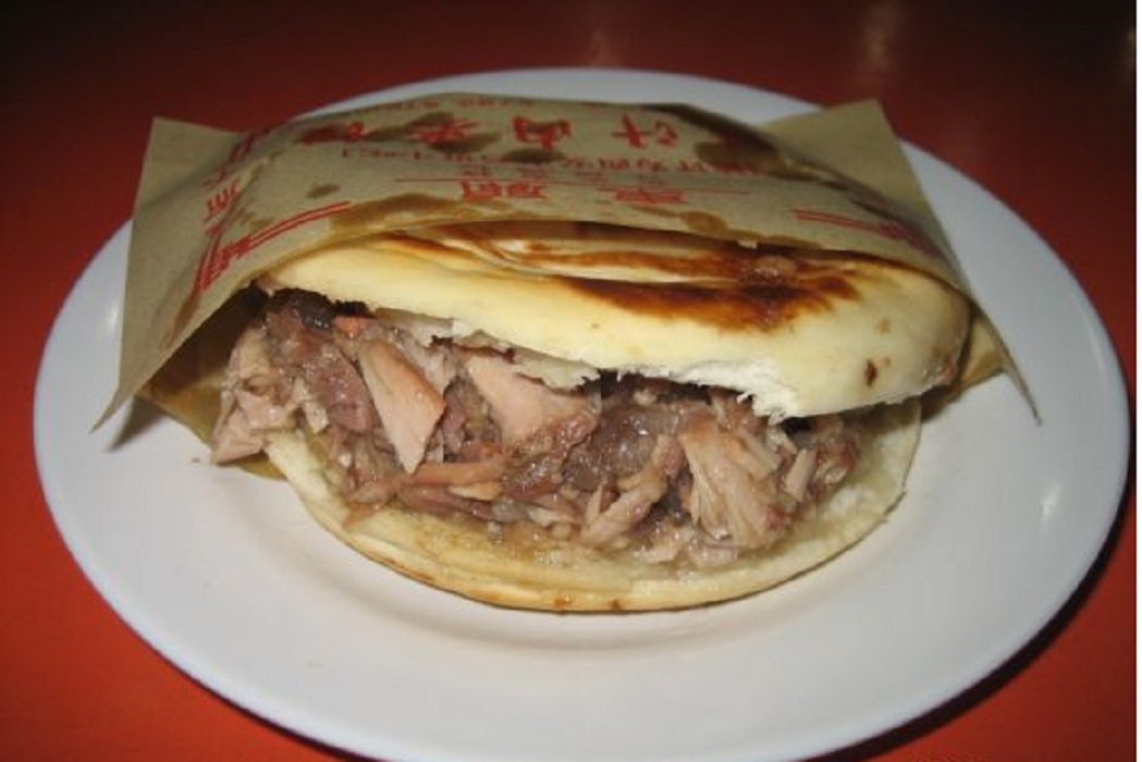 肉夹馍,是用烤制的面饼,中间用刀划开,夹入卤好的酱肉,再淋上肉汁,撒上香菜等,咬一口喷香。感觉应该叫馍夹肉才对,但肉夹馍不知是咋叫起来的。可能世间最好的搭档里就应该有肉、夹馍,酱肉加上烤制的面饼吃起来是一种回味悠远的香甜。 记得小时候,每到去上学的时候,都会在学校门口买一个肉夹馍带到学校里去吃,那香味让人留恋。