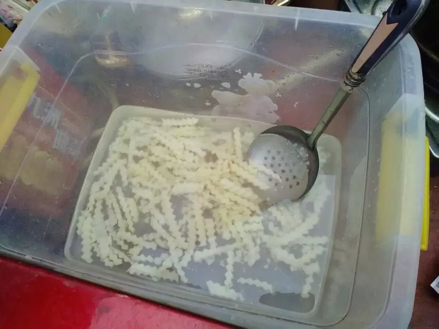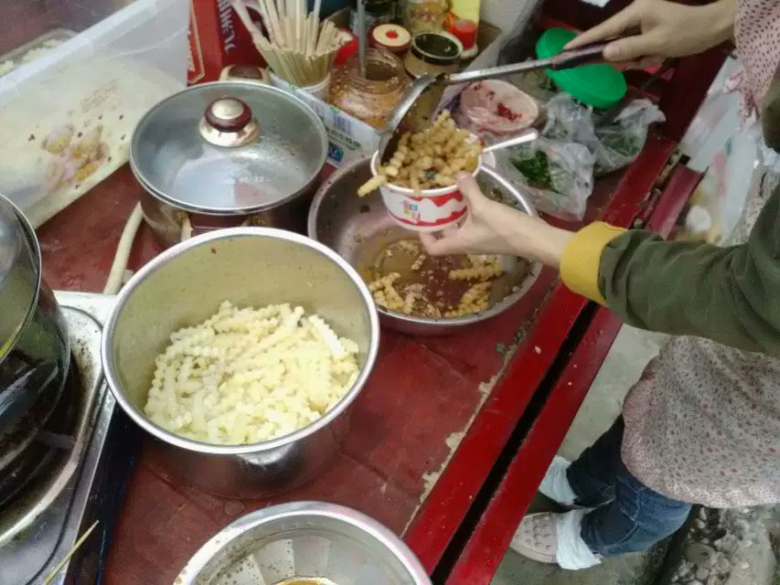 狼牙土豆在我们四川很常见,普及程度和酸辣粉差不多,最常见的摊位绝对是在学校门口,上学的时候最爱的就是去校门口买一份来吃,香味辣味让人垂涎欲滴。