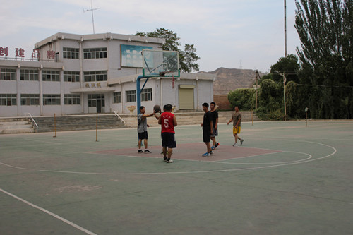 今天我们学校的老师要和乡镇上的人一起打篮球,同学们就围在操场边看。